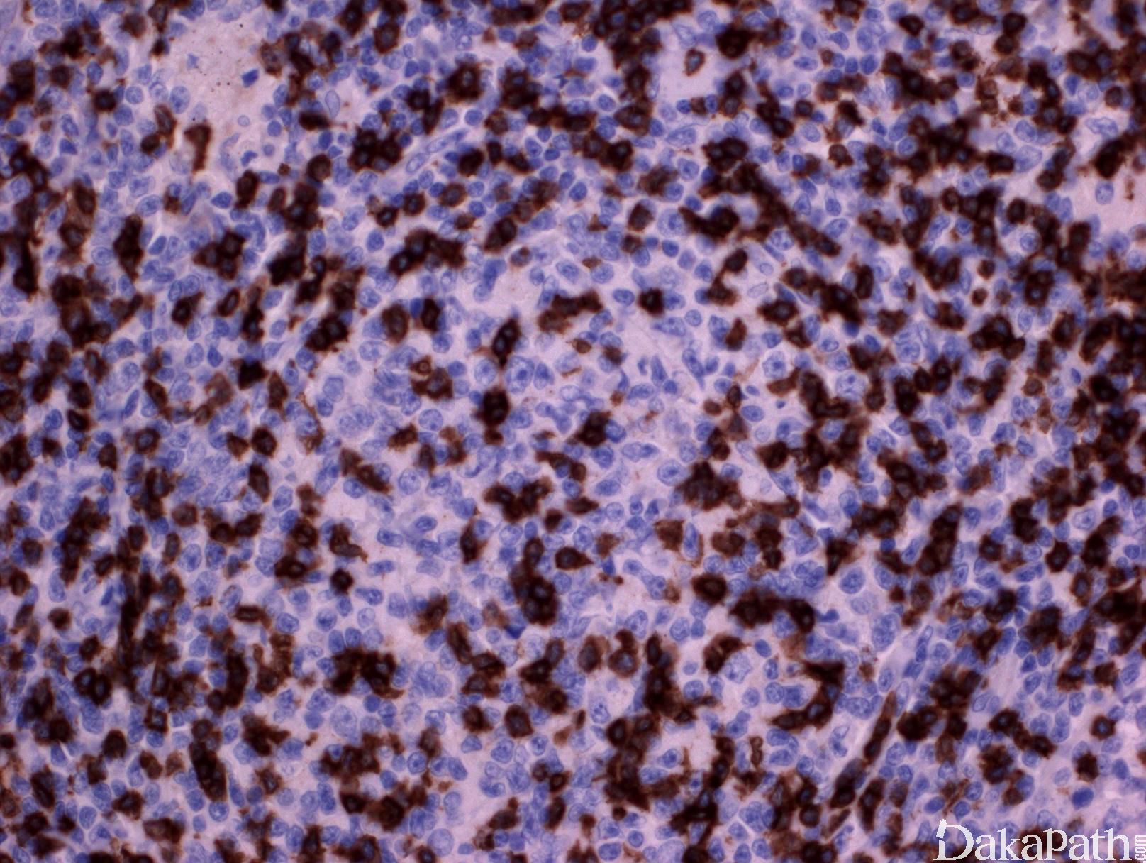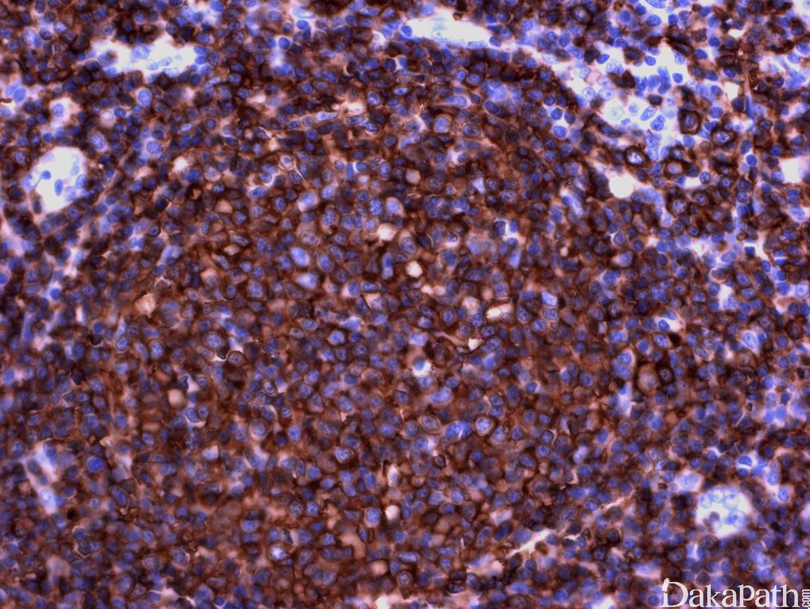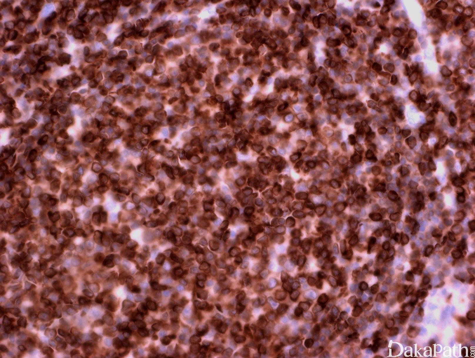 免疫表型:表达 B 细胞抗原如 CD20 和 CD19,CD10+,Bcl-6+,Bcl-2+,单克隆轻链。高级别 FL,CD10 阴性相对常见。滤胞间肿瘤细胞(低级别或高级别)常弱表达或不表达 CD10,边缘区分化区域(FL 伴边缘区分化)、骨髓或外周血中的肿瘤细胞也常不表达 CD10。滤胞间区的肿瘤细胞表达 Bcl-6 也减弱。