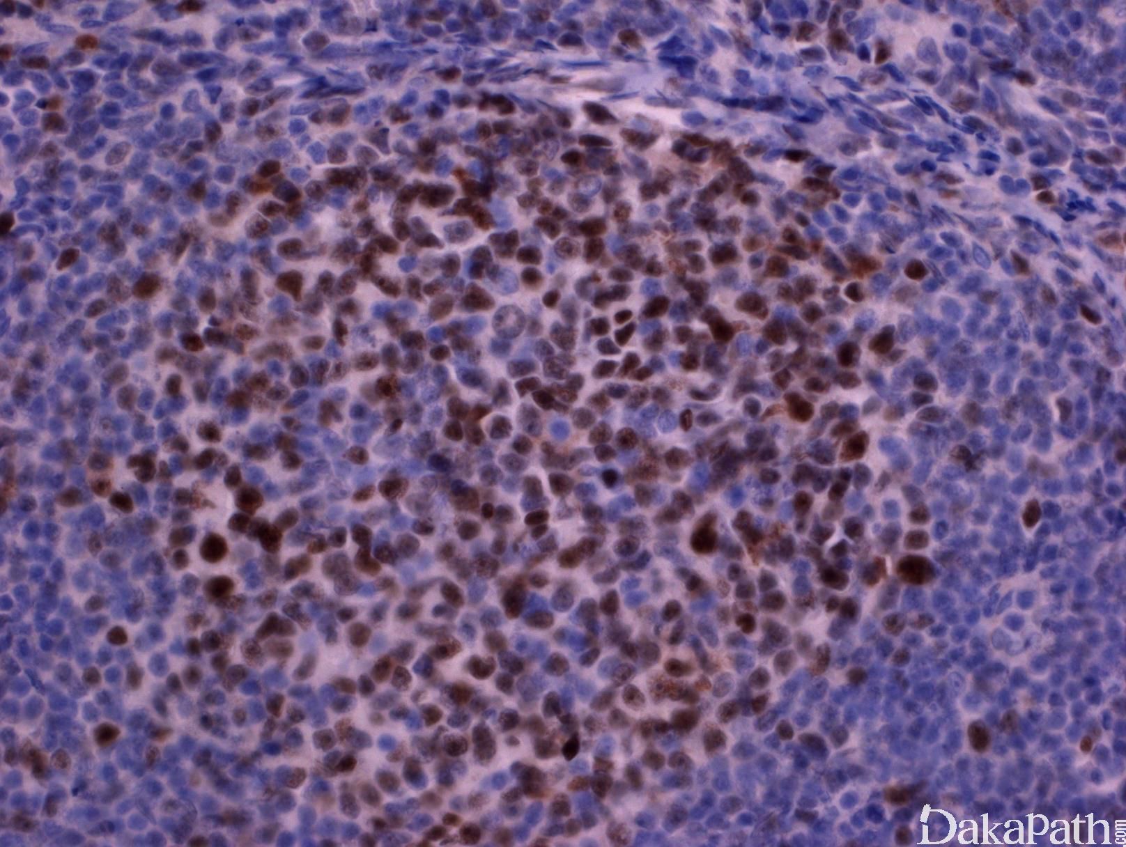 大 B 细胞淋巴瘤伴 MUM1/IRF4 基因重组 (Large B-Cell Lymphoma with IRF4 Rearrangement ):主要发生于儿童和年轻成人,典型病例累及并常局限于颈部淋巴结和 Waldeyer 环。形态上可以是高级别滤泡性淋巴瘤 (3 级),或滤泡伴弥漫侵润,或弥漫增生如同弥漫大 B 淋巴细胞瘤。MUM1/IRF4 和 Bcl-6 强表达,至少半数病例表达 Bcl-2 和 CD10,少数也表达 CD5。大多数病例有 MUM1/IRF4 基因重组,常同时有 BCL-6 基因重组,但无 BCL-2 基因易位。少数病例无 MUM1/IRF4 基因重组,但有 MUM1/IRF4 强表达。侵袭性较儿童型滤泡淋巴瘤强,但经治疗后,预后良好。