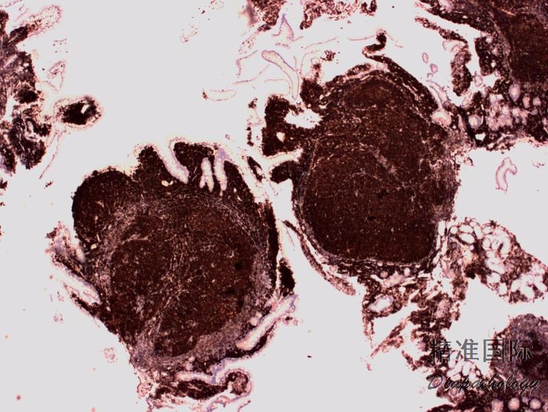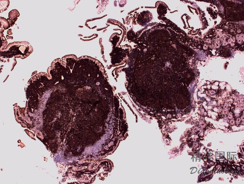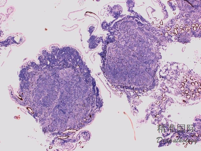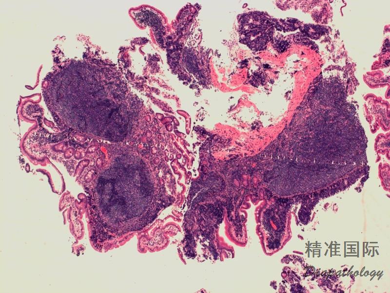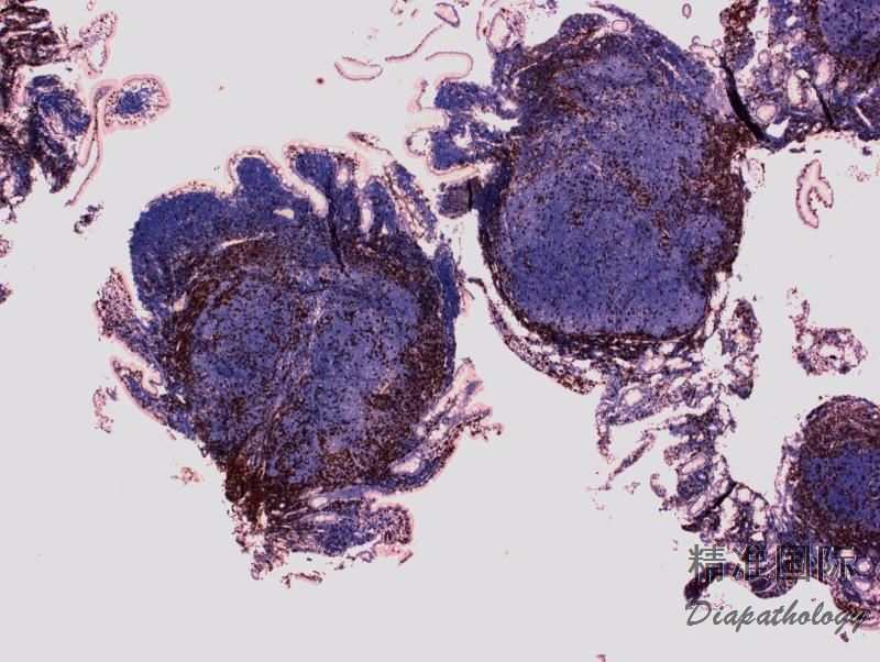 - 十二指肠型滤泡淋巴瘤 (Duodenal-Type Follicular Lymphoma): 多见于中年人,发生于小肠,多数位于十二指肠第二段,其形态、免疫表型及细胞/分子遗传学与经典滤泡淋巴瘤一致,一般为低级别,累及黏膜和黏膜下层, 不累及肠系膜淋巴结。临床表现为局限性疾病,预后佳。有别于发生于胃肠道其他部位的滤泡性淋巴瘤及结性 FL 累及肠道,需要加以鉴别。