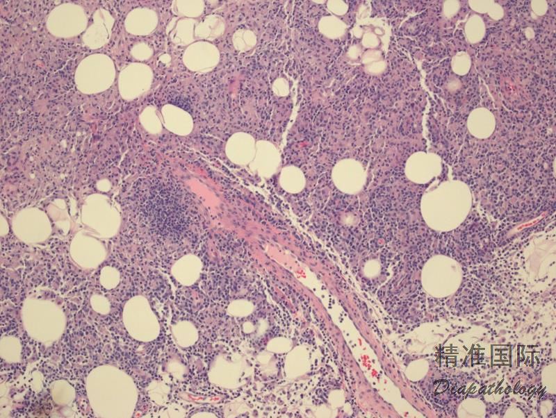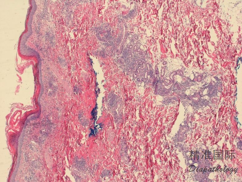 6. 狼疮性脂膜炎 :累及真皮及皮下,无亲表皮性。浸润细胞为淋巴细胞混合组织细胞及浆细胞,皮下组织常有黏液物质沉积。免疫表型为混合 CD4 和 CD8 T 细胞,CD56 和 TCR-δ 阴性。患者有自身免疫病史。