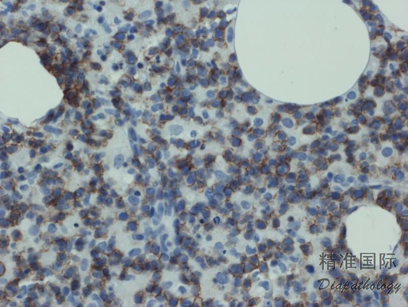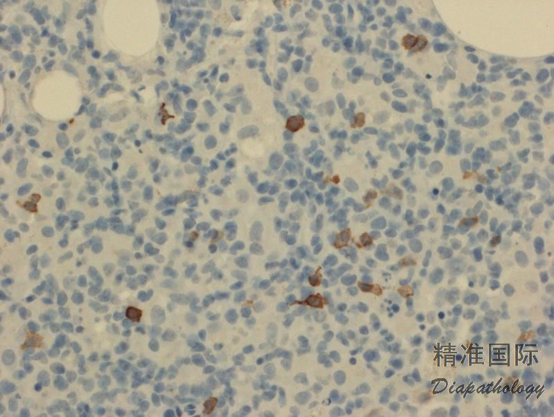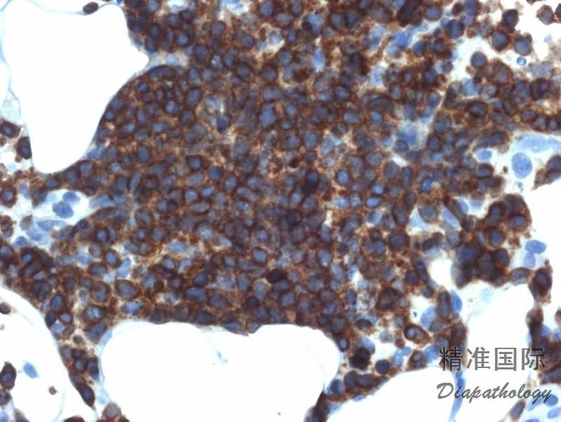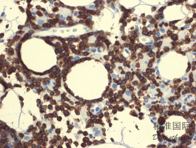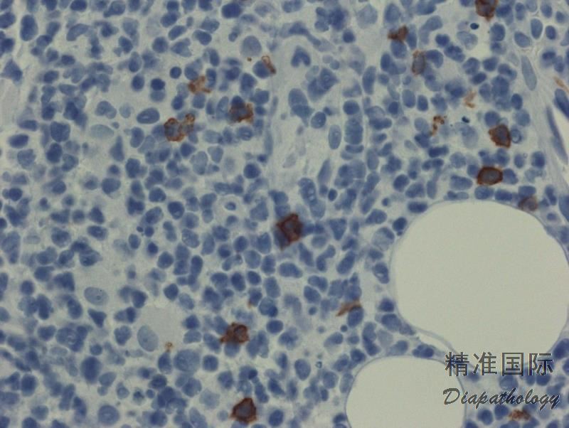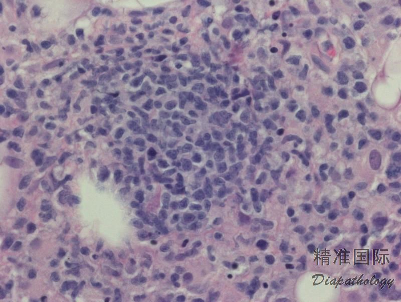 1. 母细胞性浆细胞样树突细胞肿瘤 (BPDCN):常累及皮肤,呈现弥漫真皮侵润并延至皮下,但通常不累及表皮,无血管浸润和坏死。细胞核染色质细腻,除表达 CD4 和 CD56 外,还表达 CD123 和 TCL1。