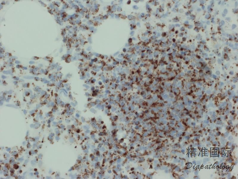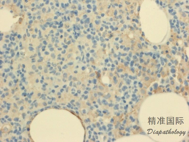 4. 免疫表型:肿瘤细胞 CD3+、CD2+、CD56+、细胞毒分子+、TCR-δ1+、 βF1-、CD4-、CD8-(少数+)、CD5-,有的病例可 TCR-δ1+、 βF1+,EBER-。