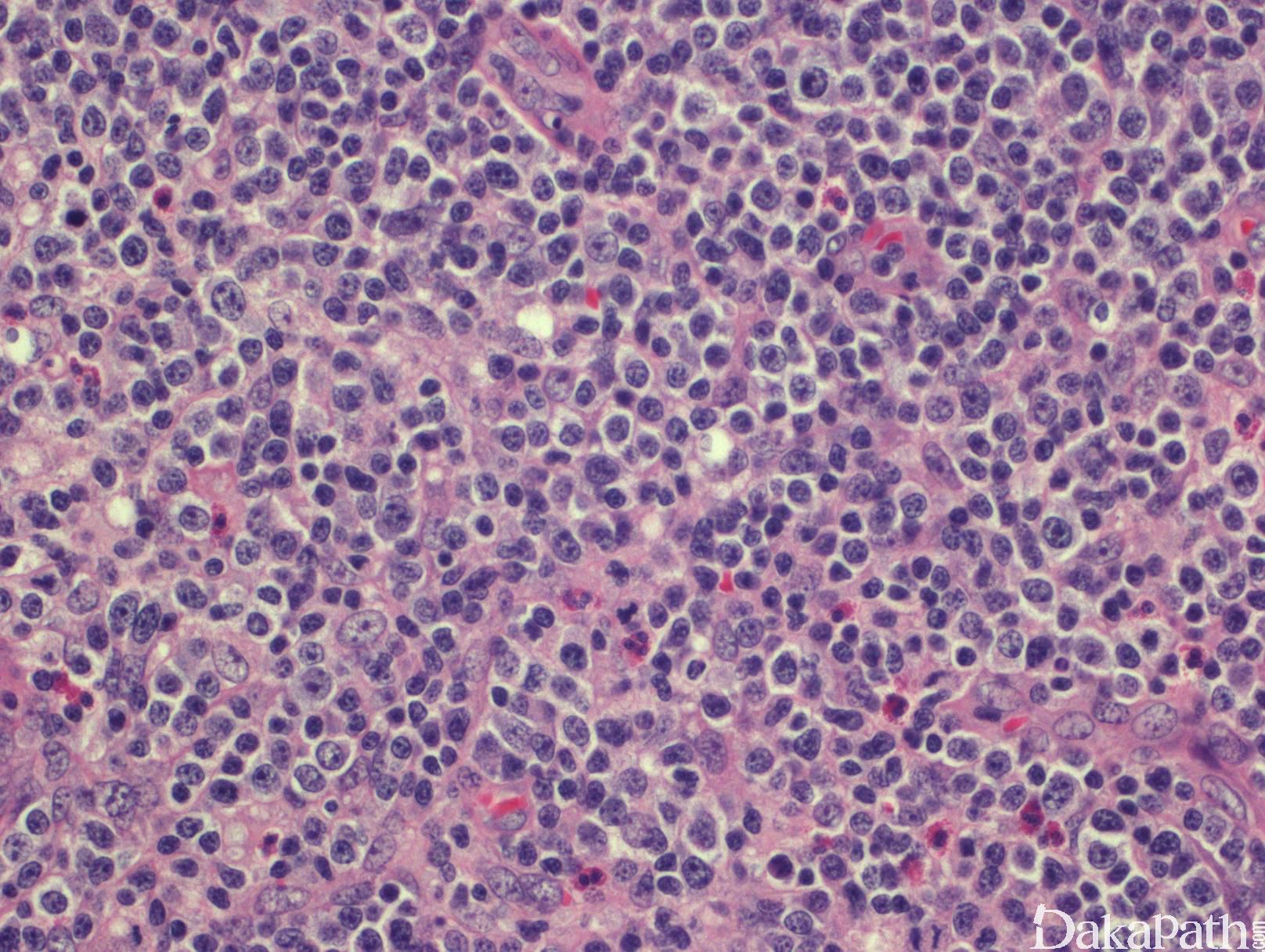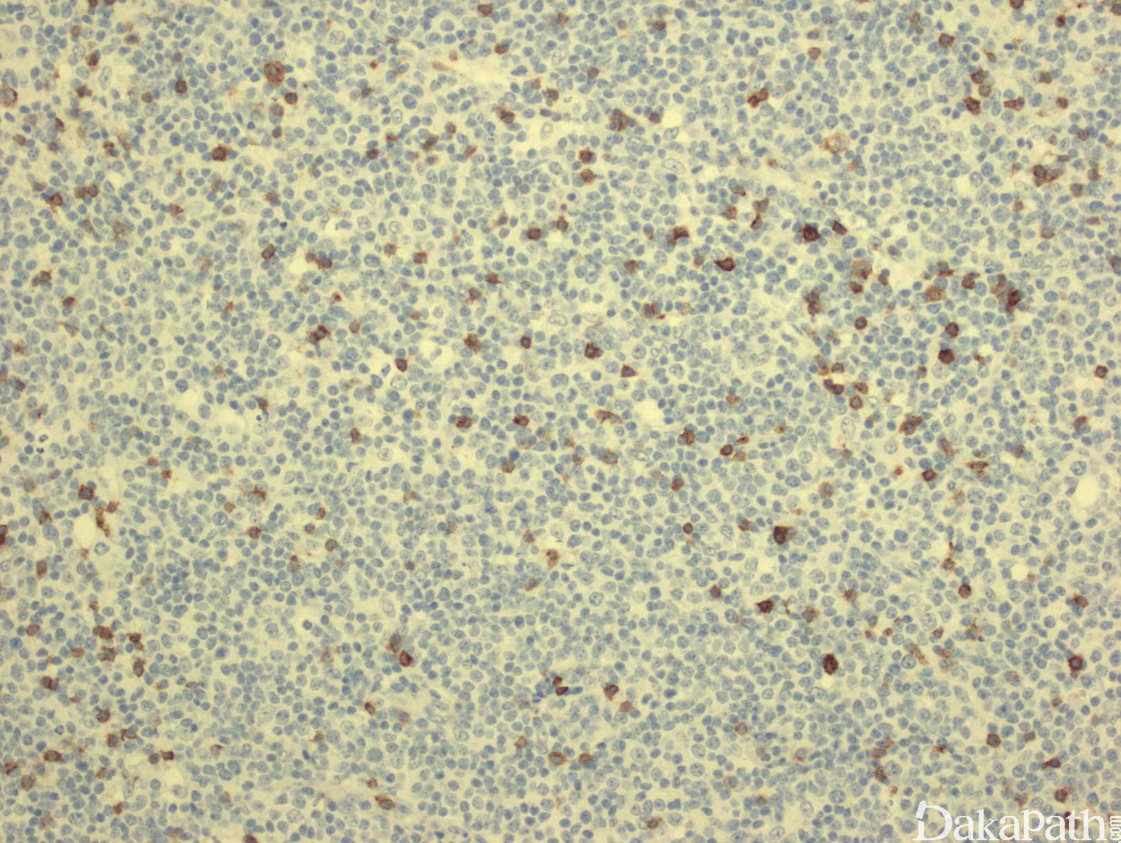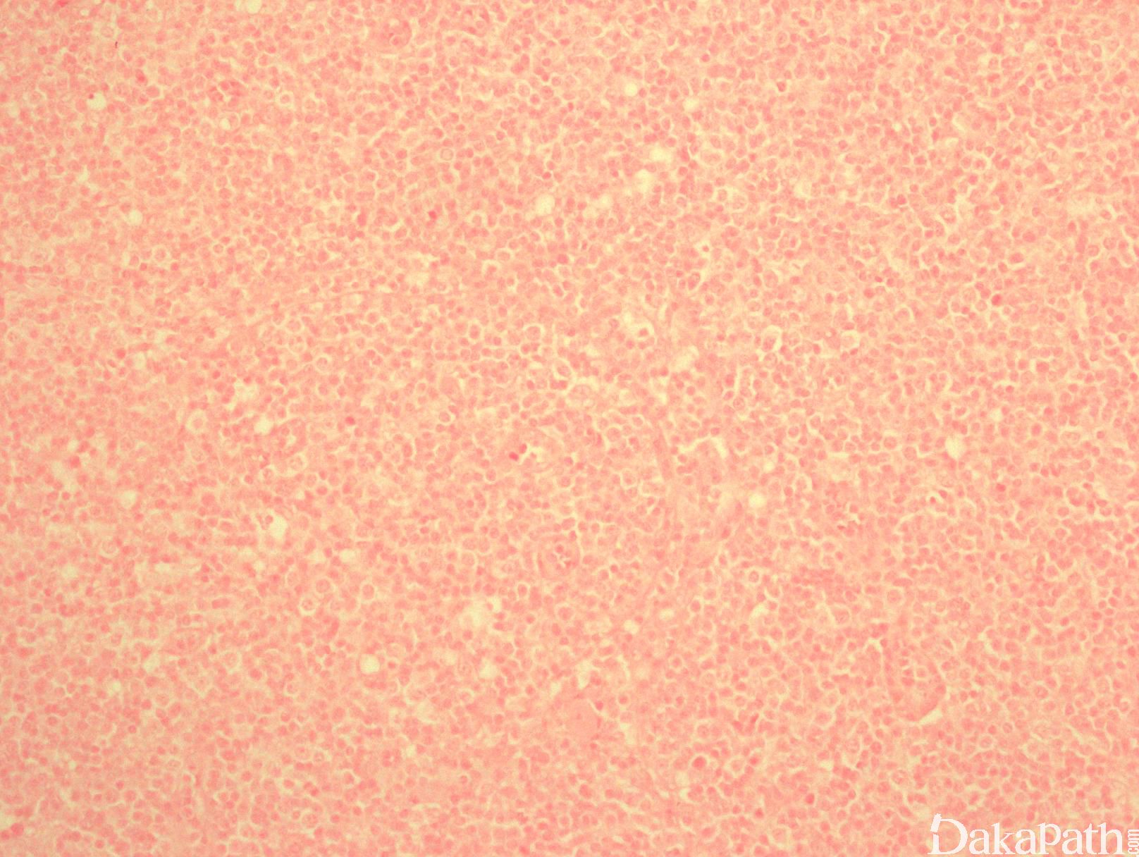 - 肿瘤细胞小到中等,但也可以是大细胞,以病例而定。多数为中等大小,胞核不规则,核仁易见,核分裂频繁,胞质少到中等,有的表现为透亮胞质。有时可见 HRS 样细胞。背景通常混有很多反应性小淋巴细胞、嗜酸性细胞、组织细胞和浆细胞。