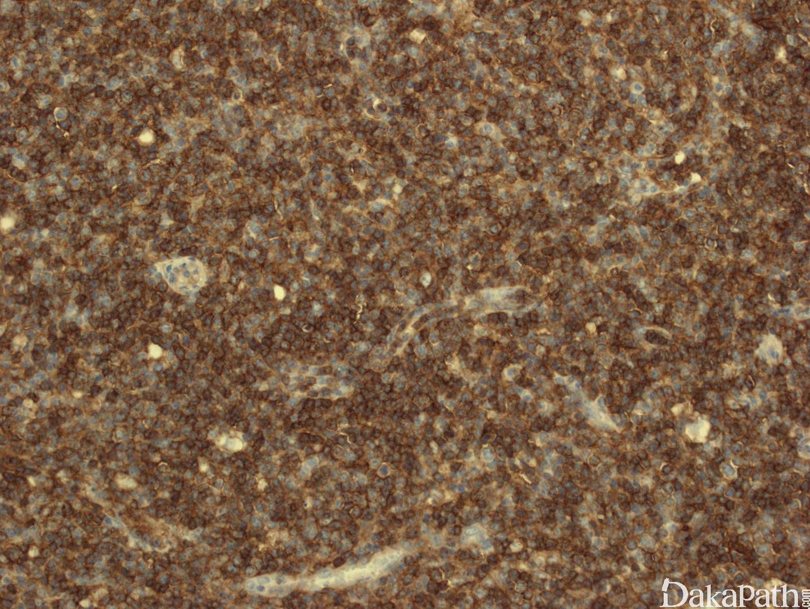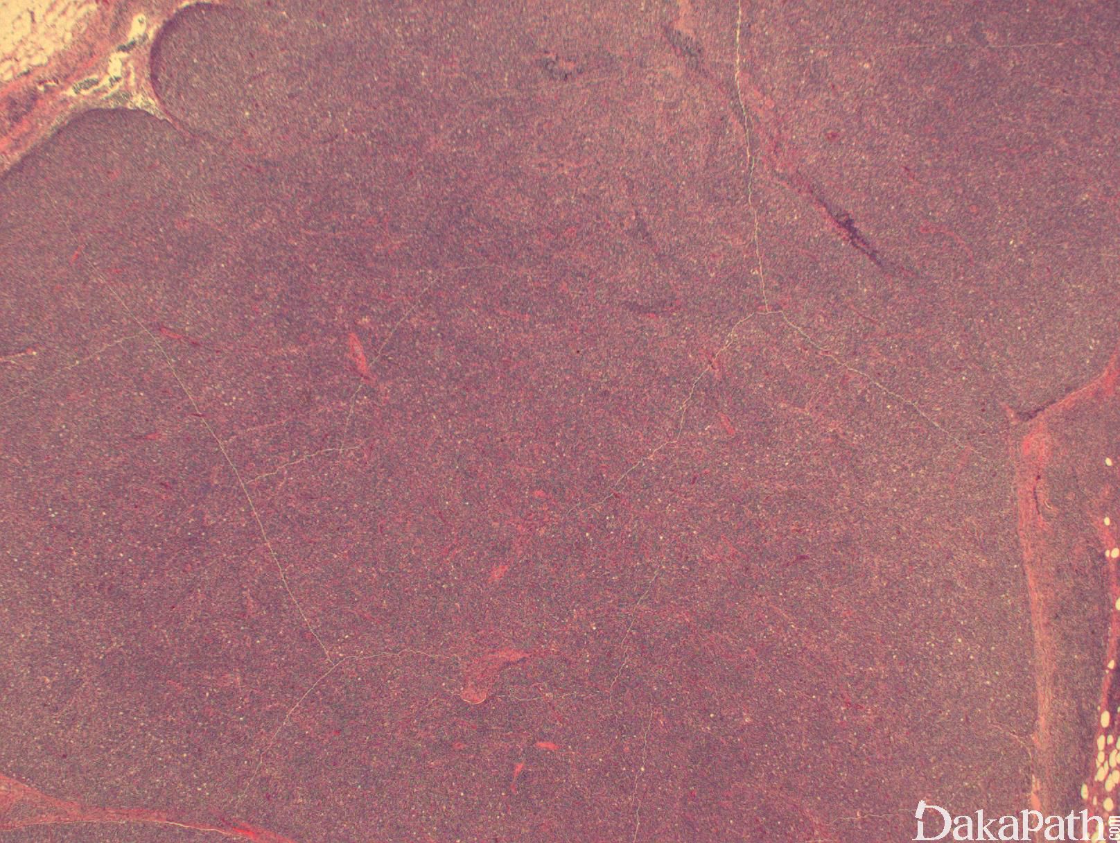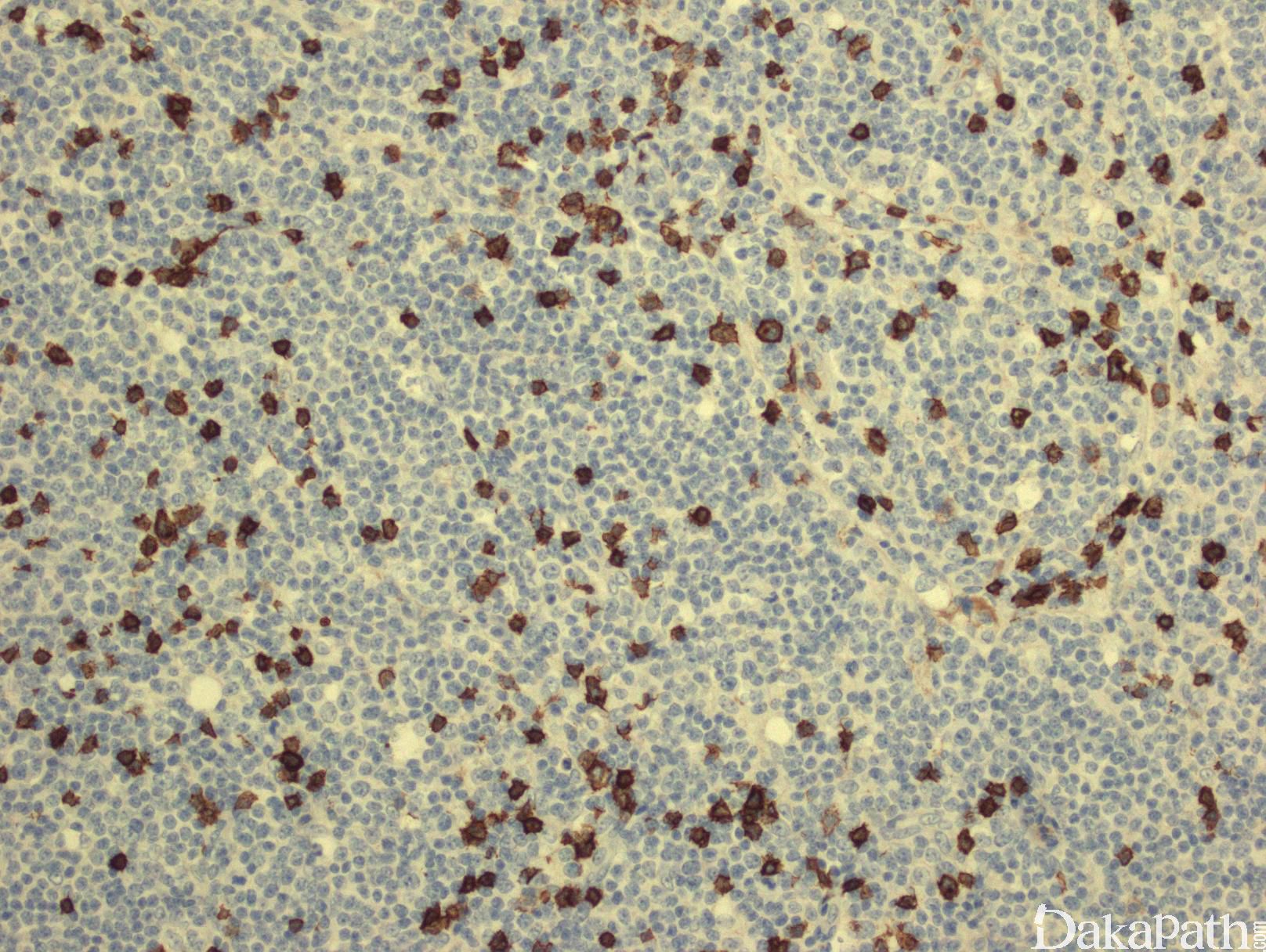 - 肿瘤细胞小到中等,但也可以是大细胞,以病例而定。多数为中等大小,胞核不规则,核仁易见,核分裂频繁,胞质少到中等,有的表现为透亮胞质。有时可见 HRS 样细胞。背景通常混有很多反应性小淋巴细胞、嗜酸性细胞、组织细胞和浆细胞。