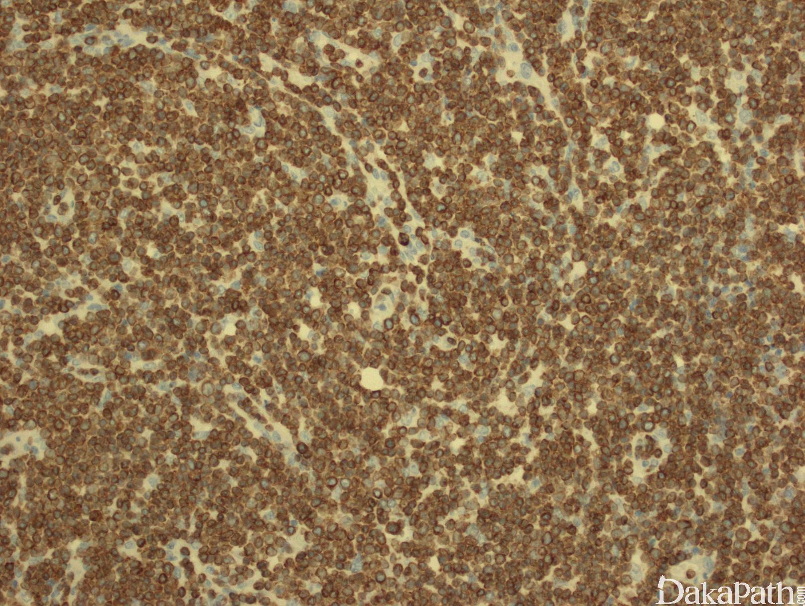 - 经典型霍奇金淋巴瘤(CHL) :PTCL-NOS 有时伴 HRS 样细胞,EBER+,CD30+,CD15-/+,需与 CHL 相鉴别。PCTL 的 HRS 样细胞为反应性 B 细胞,背景 T 细胞为具异形性的肿瘤细胞,有克隆性 TCR 基因重排,免疫表型也可能异常。而 CHL 的背景细胞为反应性 T 细胞,免疫表型正常,无克隆性 TCR 基因重排。临床和影像学表现也有助于鉴别。