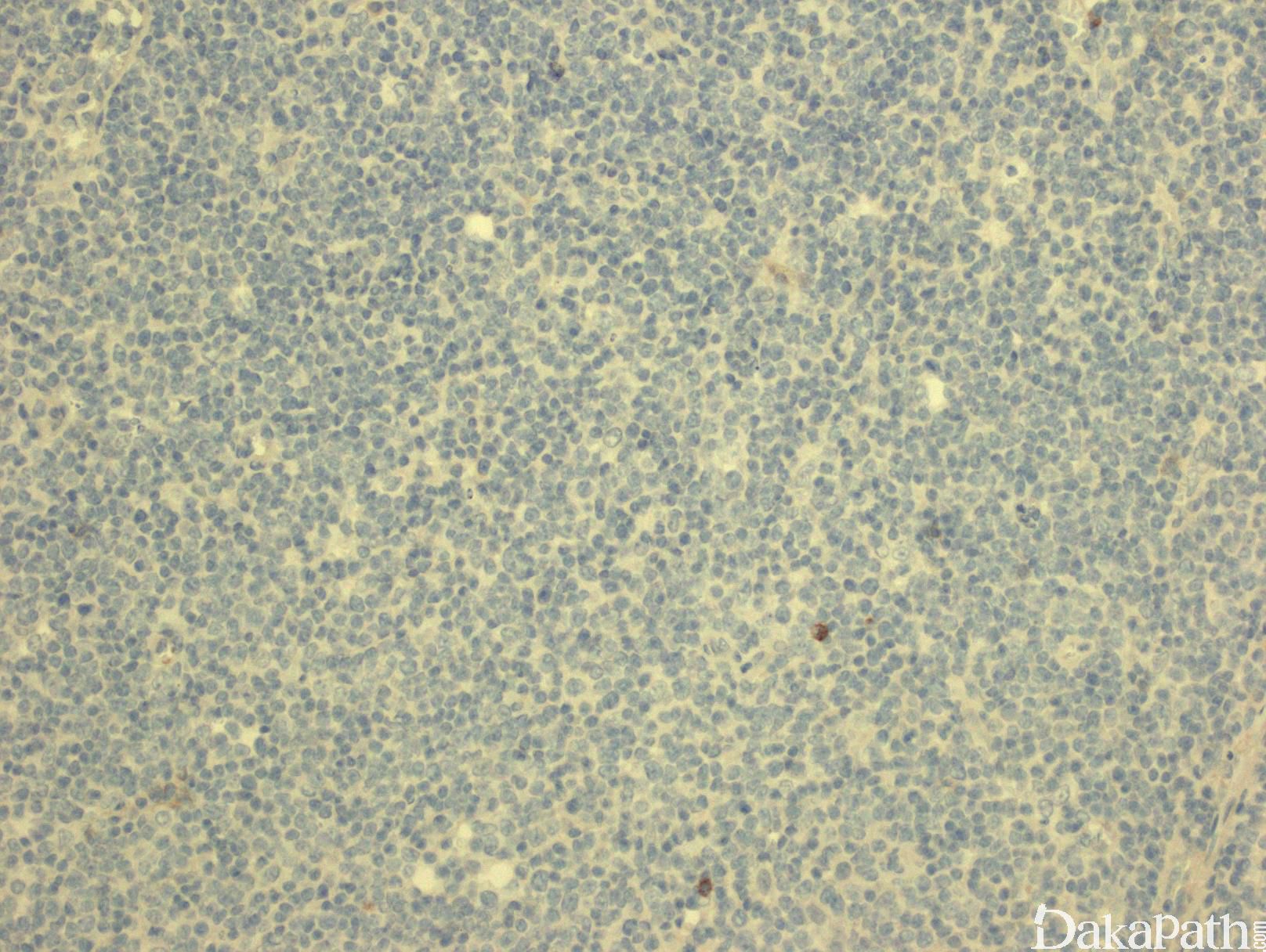 - 间变性大细胞淋巴瘤 (ALCL):少数 PTCL-NOS 病例有较多大细胞,CD30 阳性,易与 ALCL 混淆。标志性细胞、CD30 一致强阳性、EMA+、细胞毒表型、无 CD3 等 T 细胞相关抗原表达,EBER- 等支持诊断 ALCL。