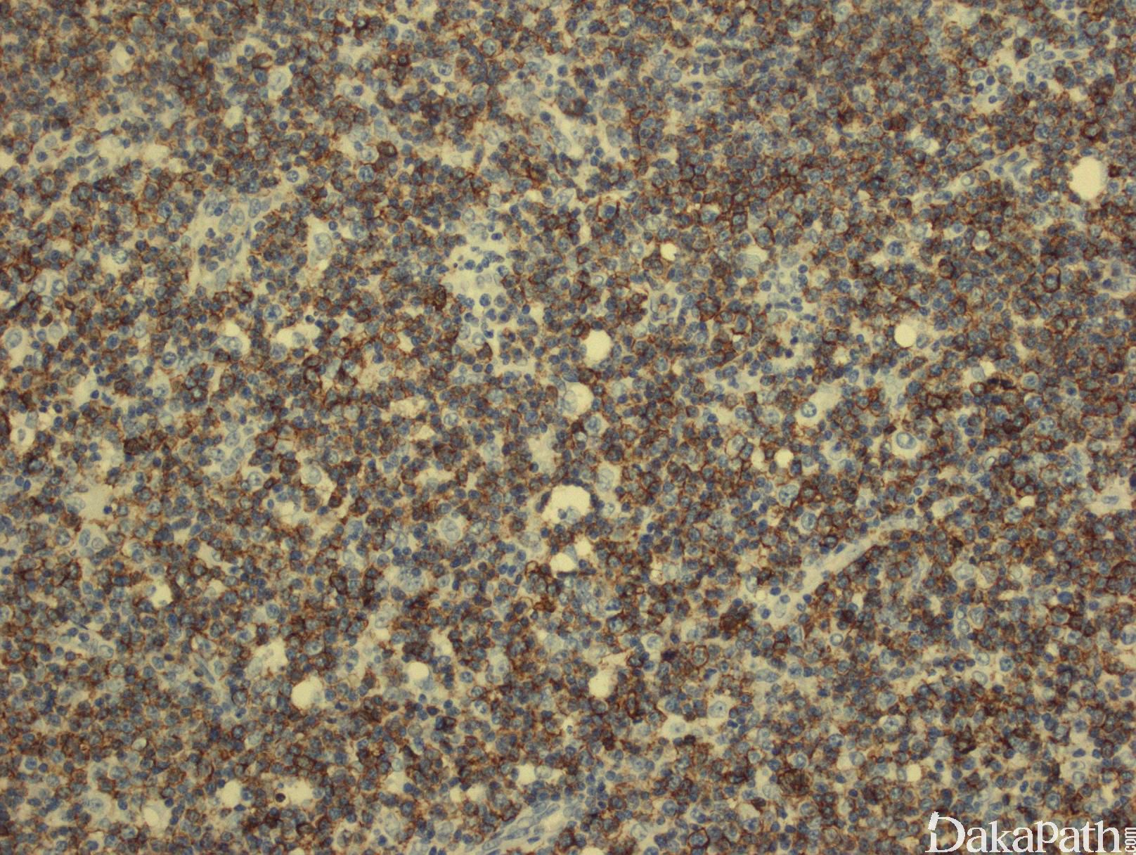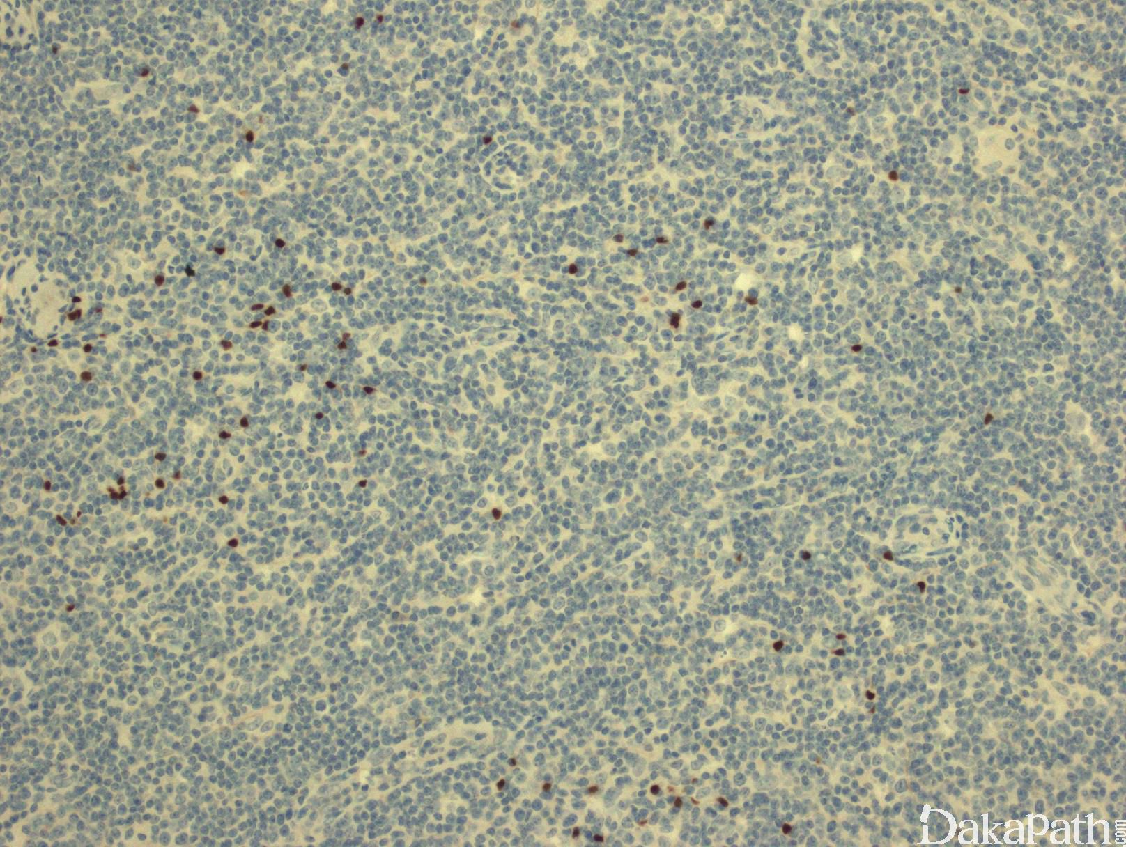 - 免疫表型:肿瘤细胞表达全 T 细胞抗原(CD3. CD2. CD5. CD7),缺失或弱表达其中一个或多个抗原常见。多数病例 CD4+、CD8-,少数 CD4-、CD8+,也有极少数为双阳性或双阴性。绝大多数病例为 TCRαβ 型(TCRβF1+) ,极少数 γδ 型(TCRβF1-)。散在大细胞可表达 CD30 ,但 CD15 阴性。也有报道 CD20 在肿瘤细胞有共表达,但绝大多数情况 CD20 显示的是反应性 B 细胞。偶尔见 B 细胞增生,但形成 B 细胞肿瘤少见。少数病例有散在 EBER +细胞(B 细胞)。