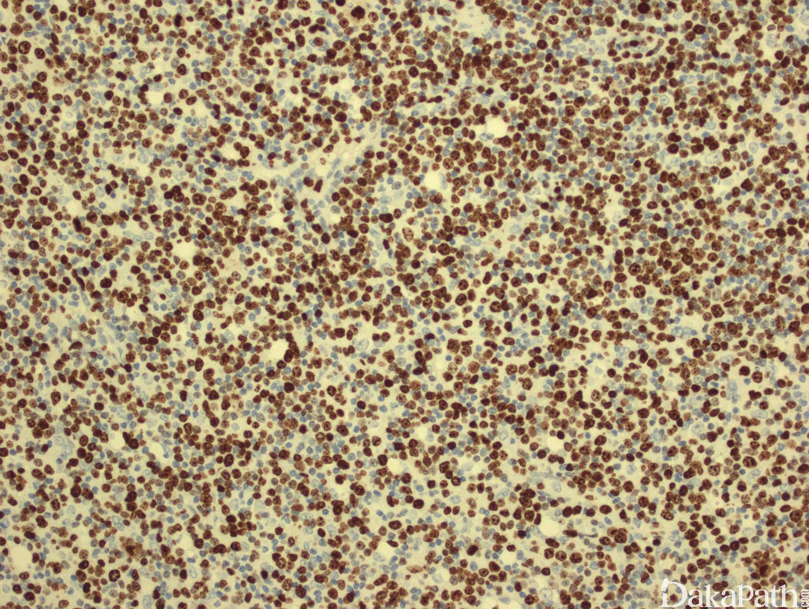 高度侵袭性,预后不良。骨髓累及、高增值指数(70%)、EBV+、CD30+