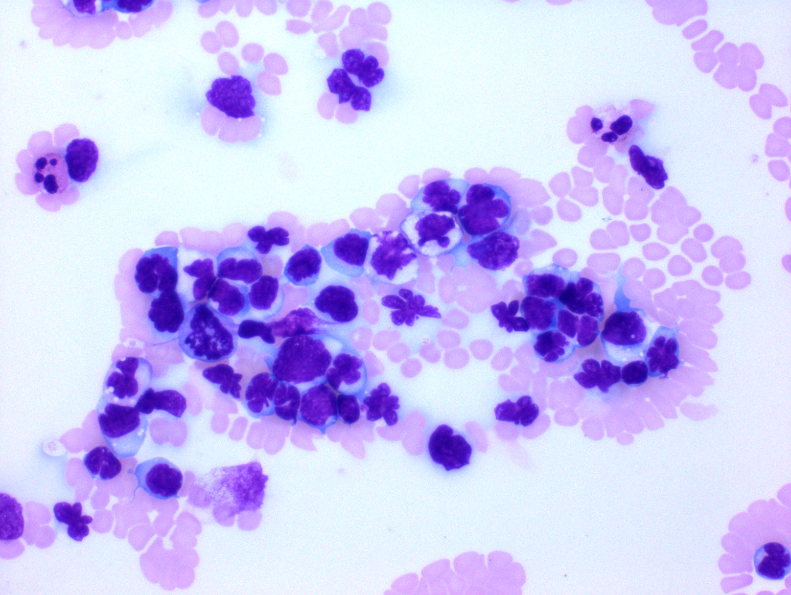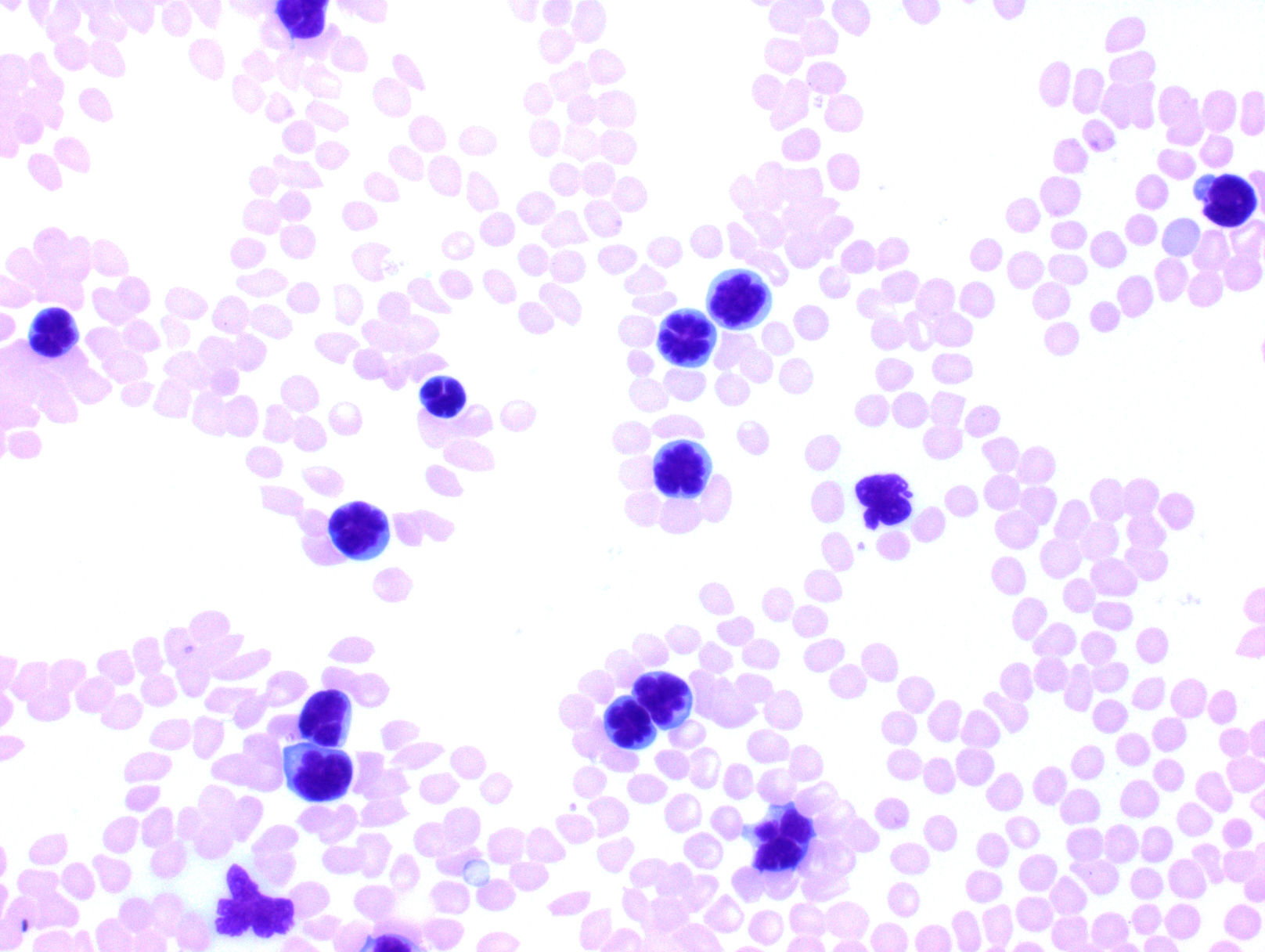4. 肿瘤细胞形态大小多样,但急性型具有典型的细胞形态(多数患者在病程某阶段表现为急性型),其特点是多叶状细胞核如花瓣样,称为花样细胞;染色质致密、深染,但花样细胞通常无明显核仁;胞质嗜碱性,可见胞质空泡。有的病例(主要是慢性和闷燃型)淋巴细胞大小形态可类似正常淋巴细胞。
