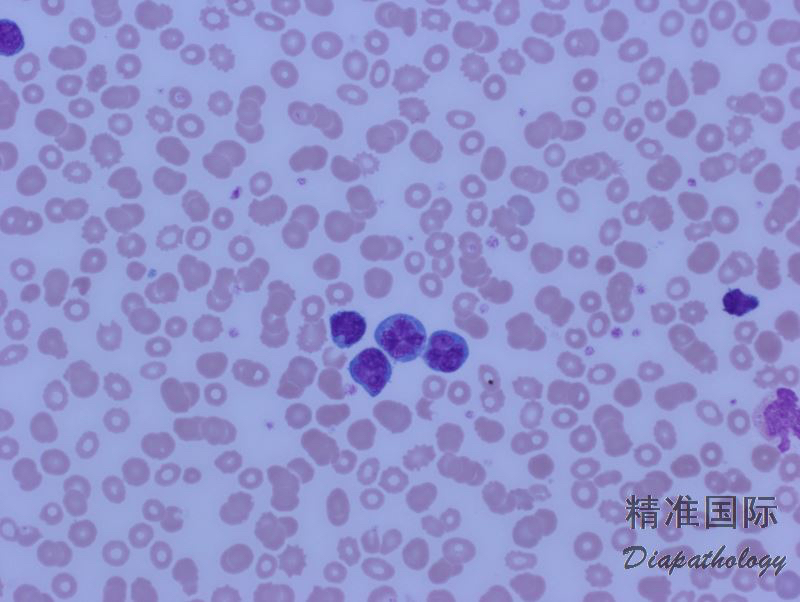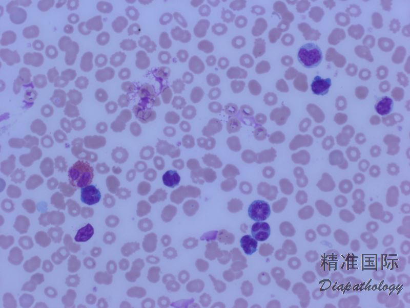 2. T 幼淋巴细胞白血病 (T-PLL): 细胞核轻度不规则,常有中心核仁,无典型花样细胞,CD25-,HTLV-1-。