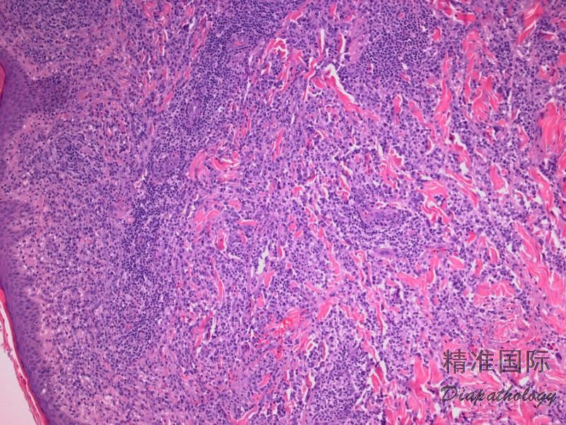 皮下脂膜炎样 T 细胞淋巴瘤 (SPTL):累及皮下组织,极少侵犯真皮。血管中心性生长少见,异型肿瘤细胞常环绕脂肪细胞生长,表面 CD3+、CD8+、CD56-,EBER-。