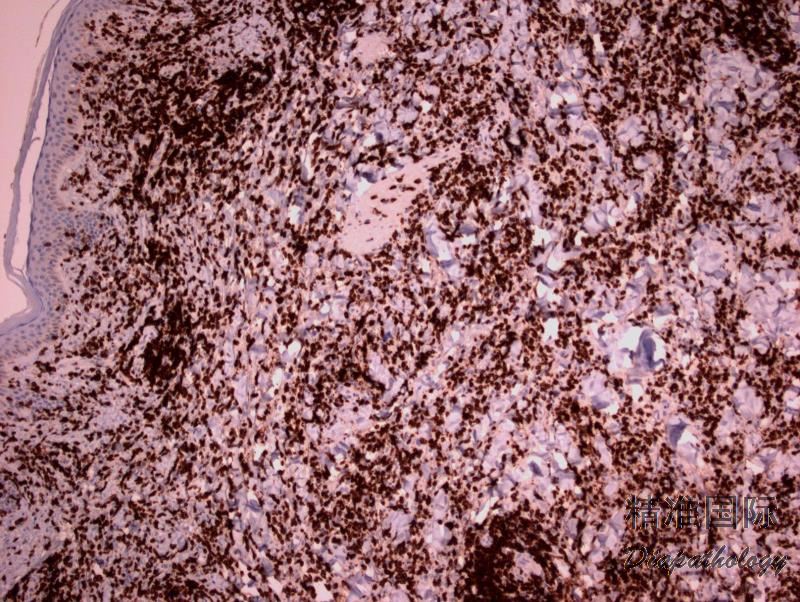 原发性皮肤 γ/δT 细胞淋巴瘤 :组织形态学与 SPTL 相似,但临床更具侵袭性。肿瘤细胞表达 CD3. CD56,不表达 CD4. CD8. CD5,EBER-。