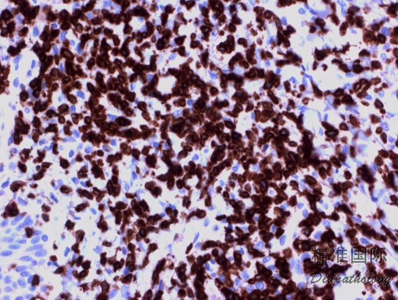 母细胞性浆细胞样树突细胞肿瘤( BPDN):形态单一、中等大小的母细胞样细胞浸润,核圆形或卵圆形,核膜薄,染色质纤细,一般无血管浸润和坏死。肿瘤细胞表达 CD56. CD4. CD123. TCL1,EBER-。
