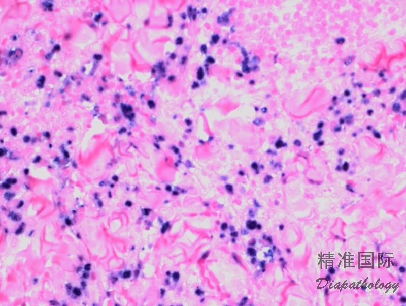 肿瘤细胞弥漫侵润伴组织地图样坏死,常累及血管(血管中心性生长),致管壁损伤、纤维素样坏死。散在凋亡小体、坏死细胞残影、核碎屑及纤维素性和血性渗出易见。