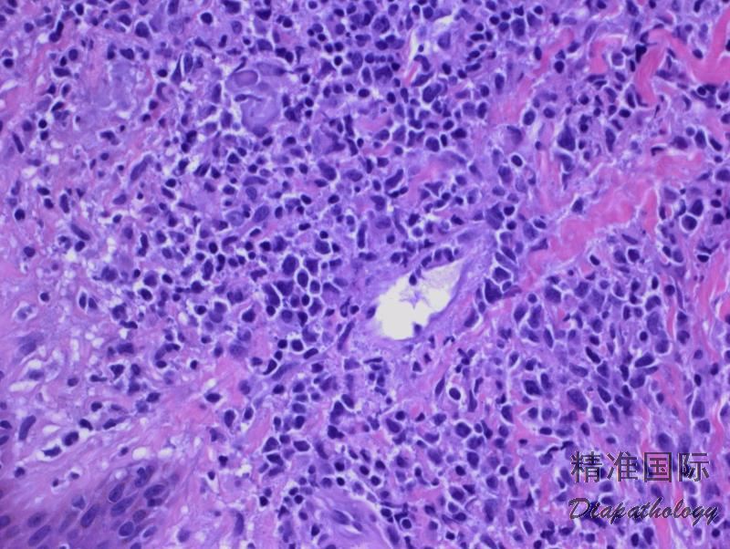 淋巴瘤样肉芽肿病 (LyG):主要累及肺部,有时也侵犯脑或皮肤。部分患者常有免疫低下病史。肿瘤细胞呈血管中心性生长,肿瘤细胞系数量不等的 CD20+、EBER+的非典型 B 细胞,混合以丰富的背景反应性 T 细胞。