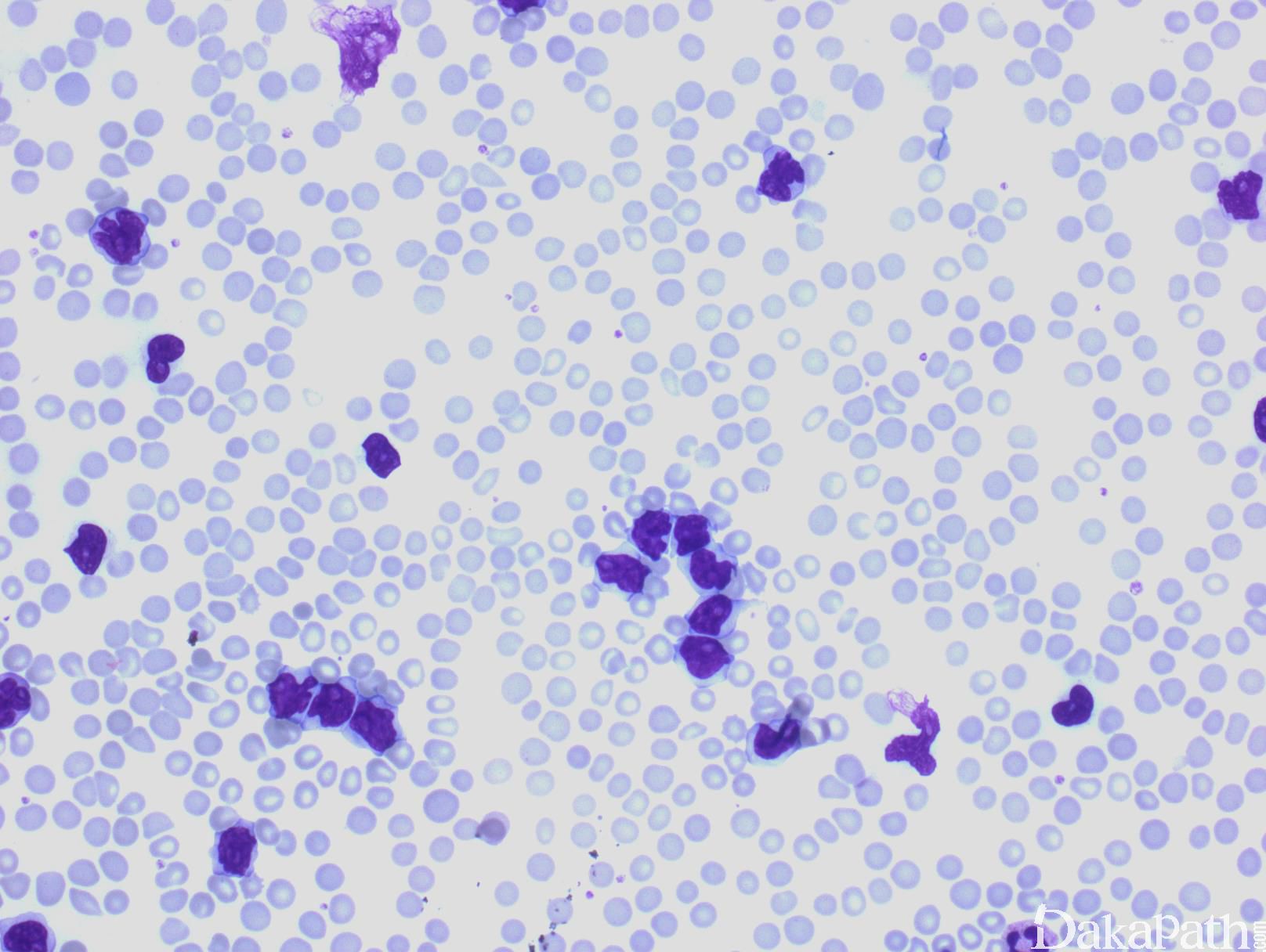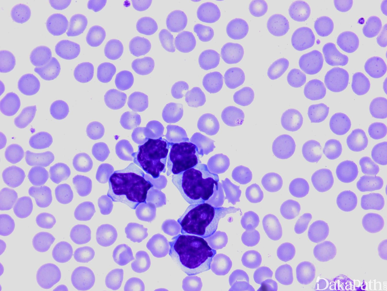 3. T 细胞大颗粒淋巴细胞白血病 (T-LGLL): 增生的淋巴细胞含胞浆颗粒,常伴粒细胞减少、贫血和自身免疫病(类风湿关节炎)。细胞免疫表型通常是 CD3+、CD8+、CD4-。临床进展缓慢惰性。