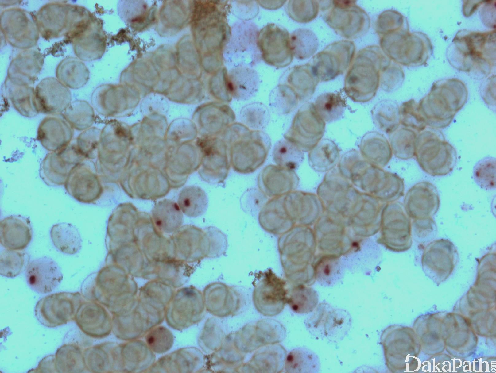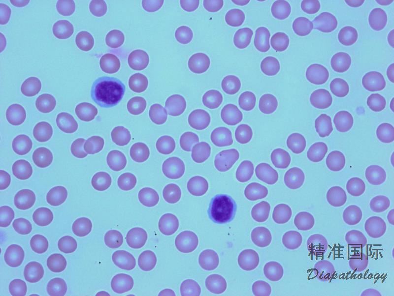 3. 形态学诊断主要根据外周血涂片。淋巴细胞中等大小,核圆、椭圆或不规则形(5%病例呈现脑回样核),染色质中度致密,有明显的中位核仁,胞质丰富、嗜碱性,无颗粒,常有胞质泡状突起。有的病例(25%)表现为小型淋巴细胞增生(小细胞亚型),核仁不明显。