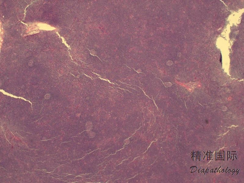 有两种生长模式:结节型和弥漫型。绝大多数病例呈结节型生长,结节为扩大的套区,有时可见偏心的生发中心。典型的 HRS 细胞散在分布结节中,有时肿瘤细胞类 LP 细胞。粒细胞和嗜酸细胞罕见(结节之间)或缺如。无纤维化。少数病例背景淋巴细胞呈现弥漫生长模式,常混有组织细胞。