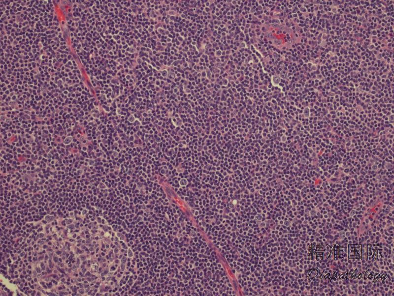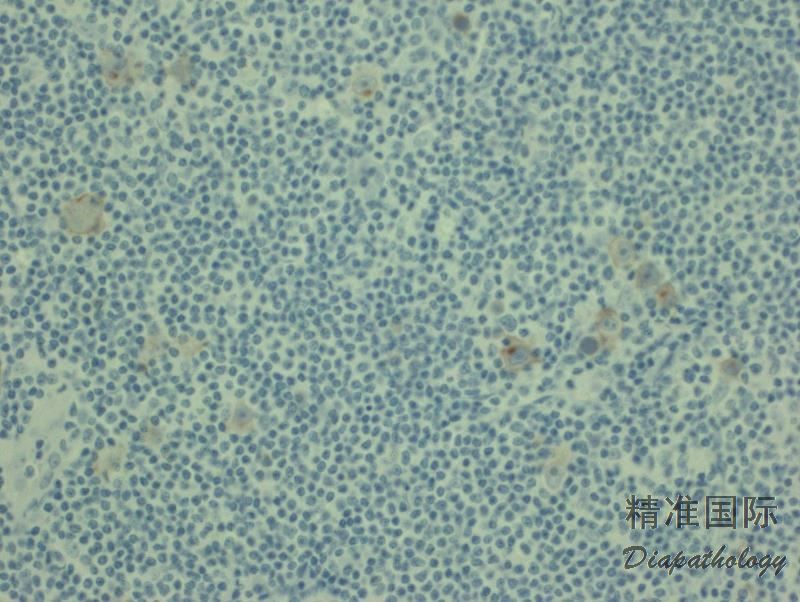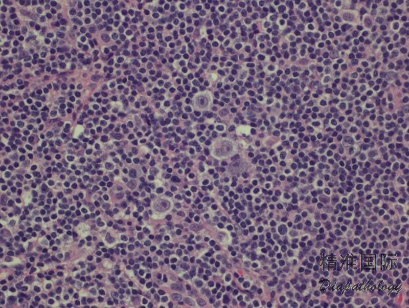 - B 小淋巴细胞淋巴瘤 (SLL)伴 HRS 细胞 :背景细胞形态学和免疫学表现为典型的 CLL/SLL 特征:CD20+(弱)、CD5+、cyclin D1-,HRS 样细胞 CD30+,CD15+/-,EBER+。无炎性背景细胞。
