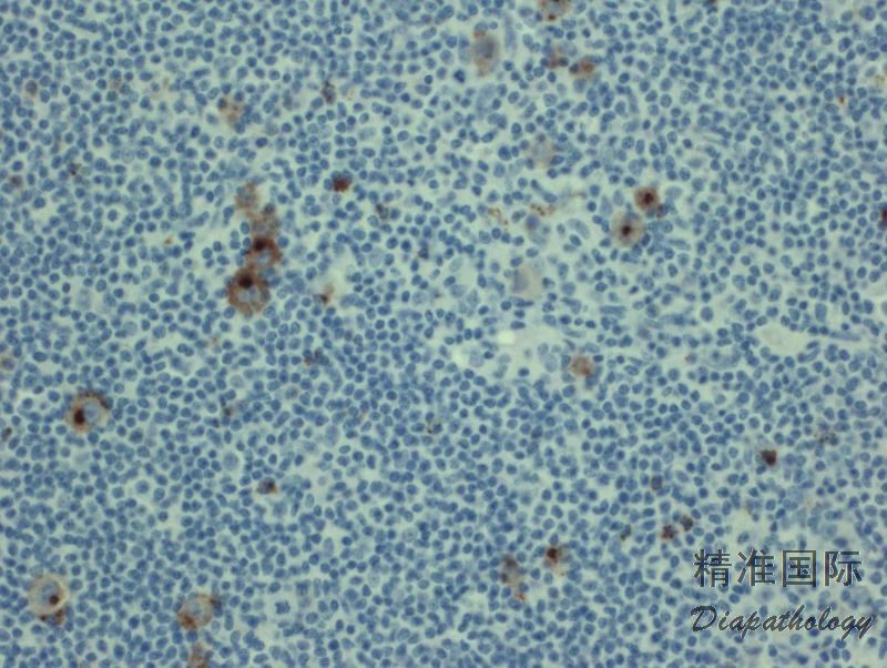 免疫组化:肿瘤细胞 CD30+,CD15+/-,PAX5+,MUM-1+,CD20-/+,OCT2-/+,BOB1-/+,EBER+(40%),CD79a- ,CD45-,EMA-,ALK-。背景细胞表达全 B 抗原,但弥漫型可有大量 T 细胞。部分病例可见 T 细胞环绕 HRS 细胞。
