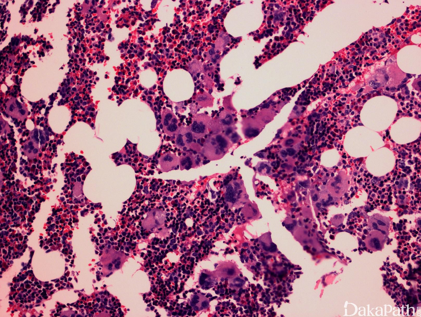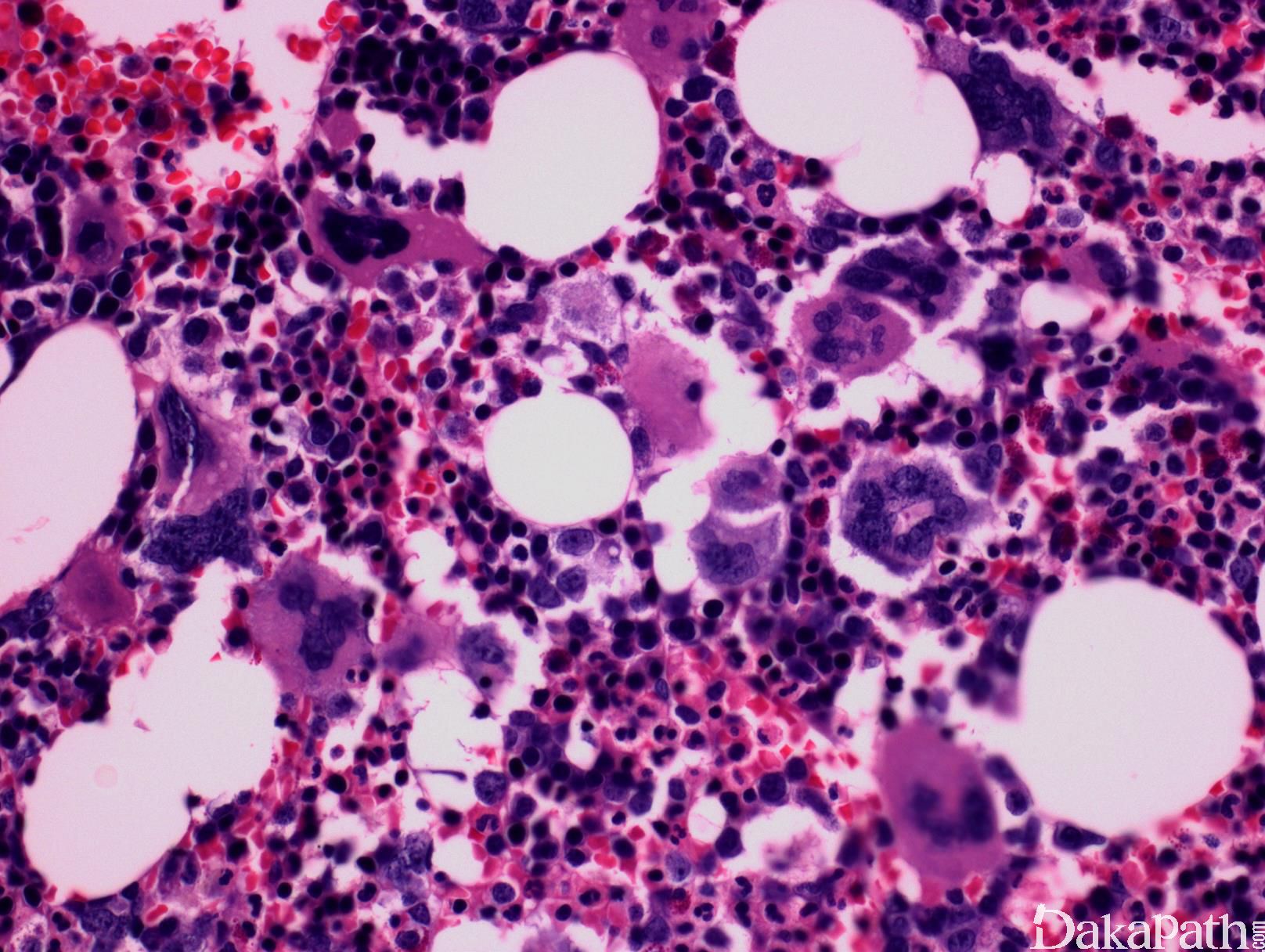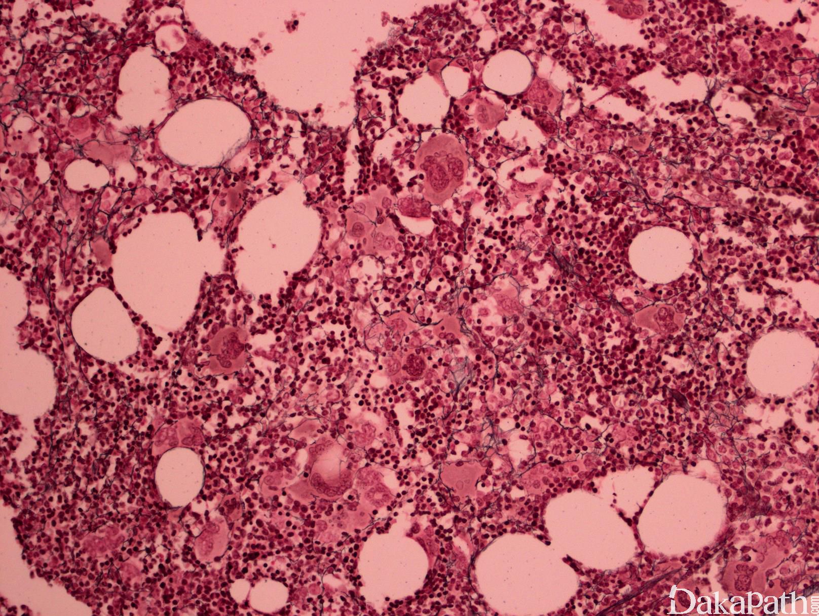 3. MDS 伴纤维化 :常见于高级别 MDS。外周血小板常减少,或全血细胞减少,可见原始细胞或发育异常细胞。骨髓巨核细胞无明显增生,常有发育异常(小型、分页少),粒系和红系也可见发育异常,原始细胞增多。细胞遗传学也有助鉴别。