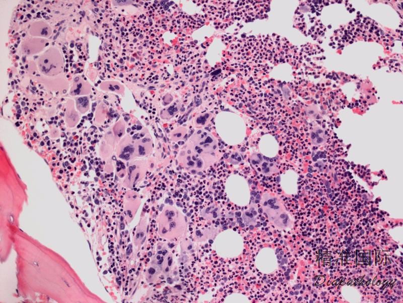 4. 骨髓细胞密度增高,中性粒系增生,巨核系明显增生并高度不典型(巨核细胞聚集、核异常分叶、云状核、裸核、奇异形核),无或极微网硬蛋白纤维化。