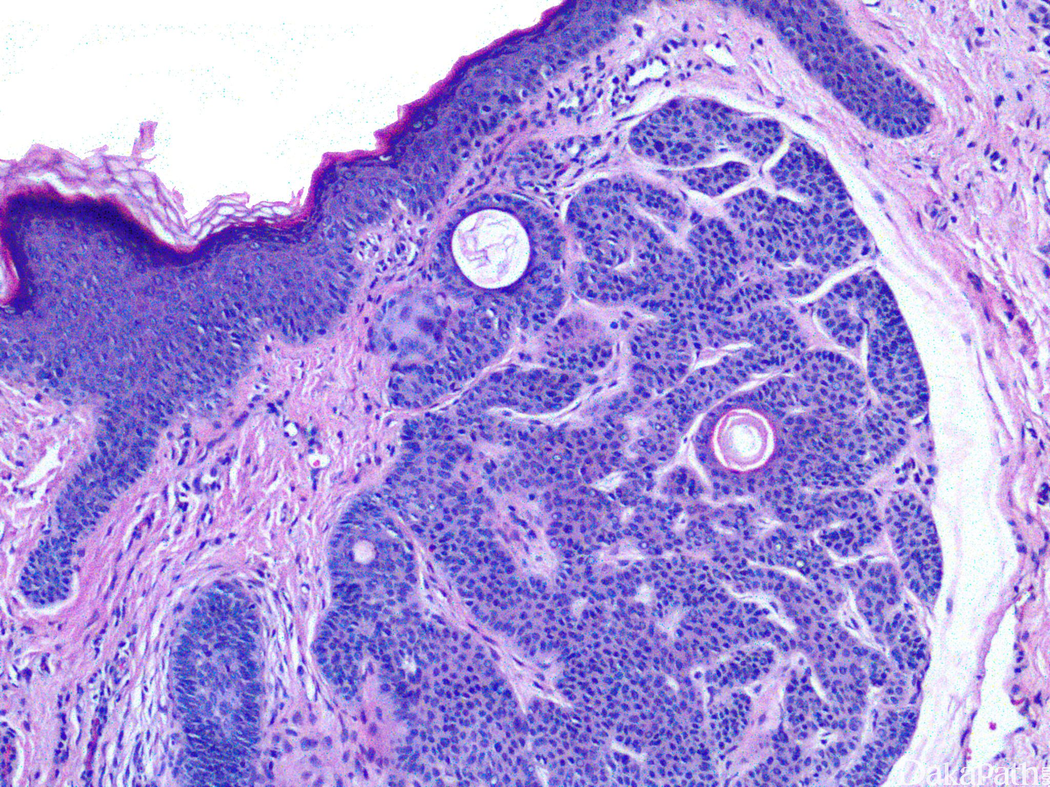 病变界限界清,镜下见真皮内基底样细胞增生,呈细条带和分支条索状互相吻合,常与表皮相连或与毛囊邻近或相连;