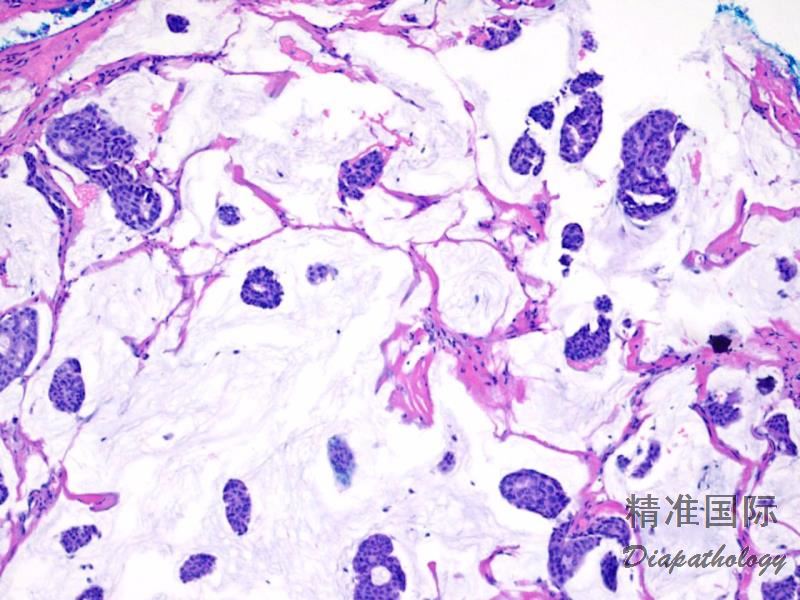 镜下显著的特征是肿瘤细胞漂浮于黏液背景中;