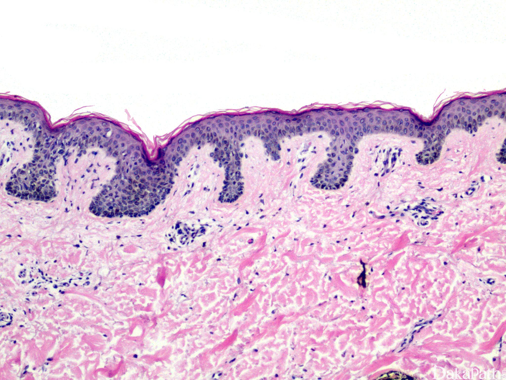 黑色素瘤 :不对称增生更加明显,界限更加不清,于表皮-真皮交界处显示更复杂的生长模式,并伴有上皮脚消失或表皮缺失。