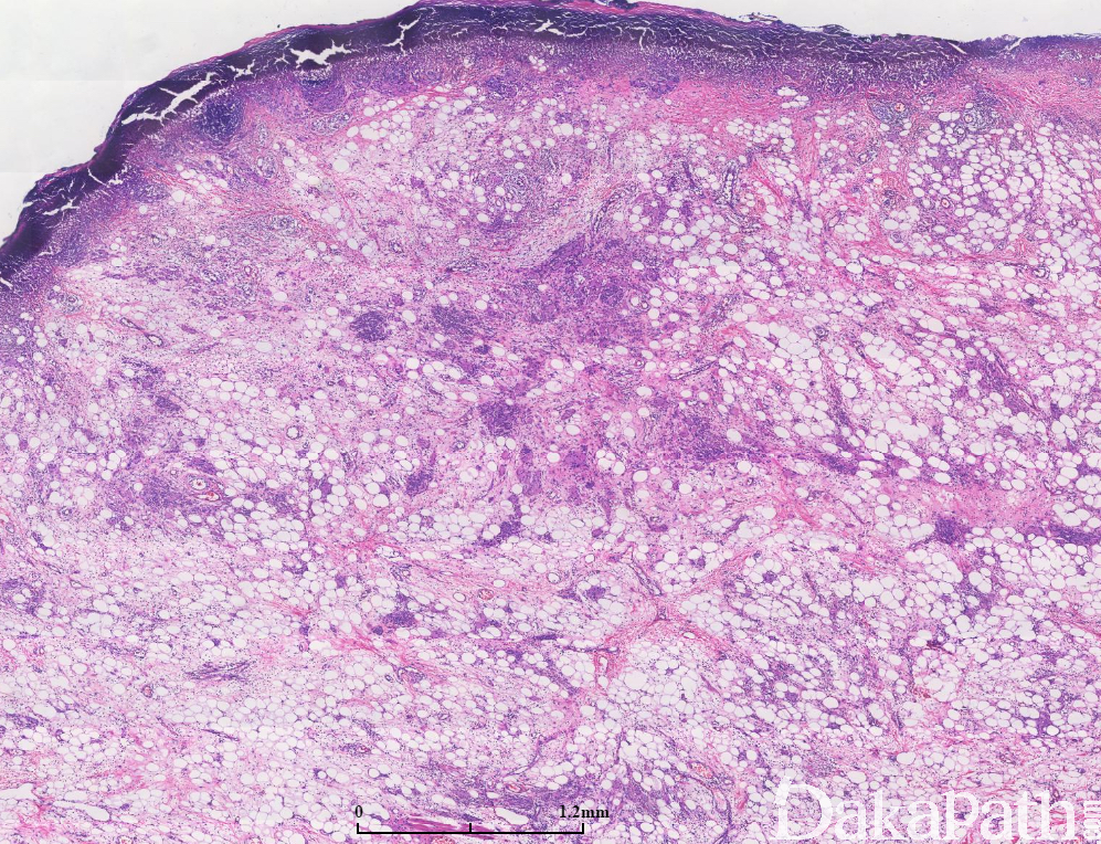 表皮下见病变大部分由成熟脂肪细胞构成,大致对称,主要累及真皮,脂肪细胞混杂有散在的梭型细胞,气球样细胞,近表皮处可见成团排列的细胞,个别细胞核增大,胞浆空泡状,偶见多核细胞,病变近底部处可见触觉小体样结构。无片状坏死,未见核分裂象。皮肤表皮可有破溃。