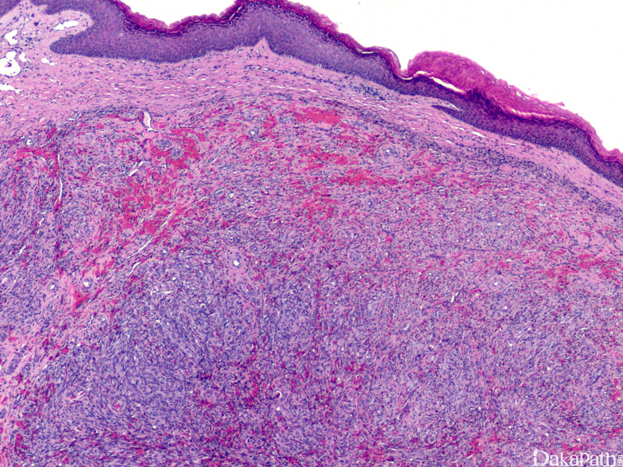 纤维肉瘤 :梭形细胞间无裂隙状血管,无红细胞外渗和透明小体,肿瘤周边无增生扩张的血管或淋巴管,免疫表型不表达血管内皮标记。