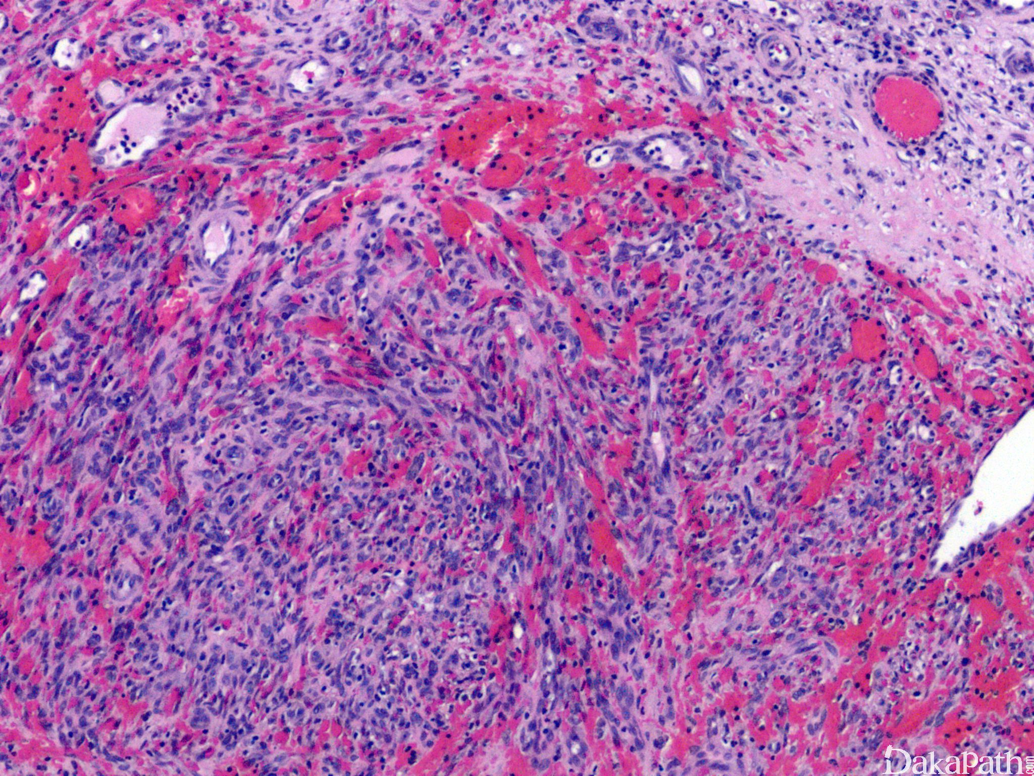 IV 期为结节期:结节期的病变边界清楚,主要由网状或裂隙状的毛细血管及其周围纵横交错的嗜酸性梭形细胞组成,梭形细胞有一定异型性,核分裂偶见;梭形细胞和血管之间为含有红细胞的裂隙,横切面呈筛孔状或蜂窝状,在梭形细胞内或细胞外可见抗淀粉酶消化 PAS 阳性的嗜伊红色透明小体,结节的边缘常见炎症细胞浸润、含铁血黄素沉着和扩张的血管。 典型的卡波西肉瘤细胞无明显的异型性,核分裂像也不多见,但少数病例中瘤细胞分化较差,异型性明显,可见较多的核分裂像。