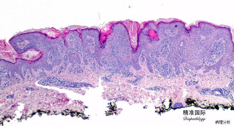 2. 日光性角化病 :日光性角化病通常可见基底层角质形成细胞胞核增大深染、拉长和重叠,并可见更明显的角化不全。