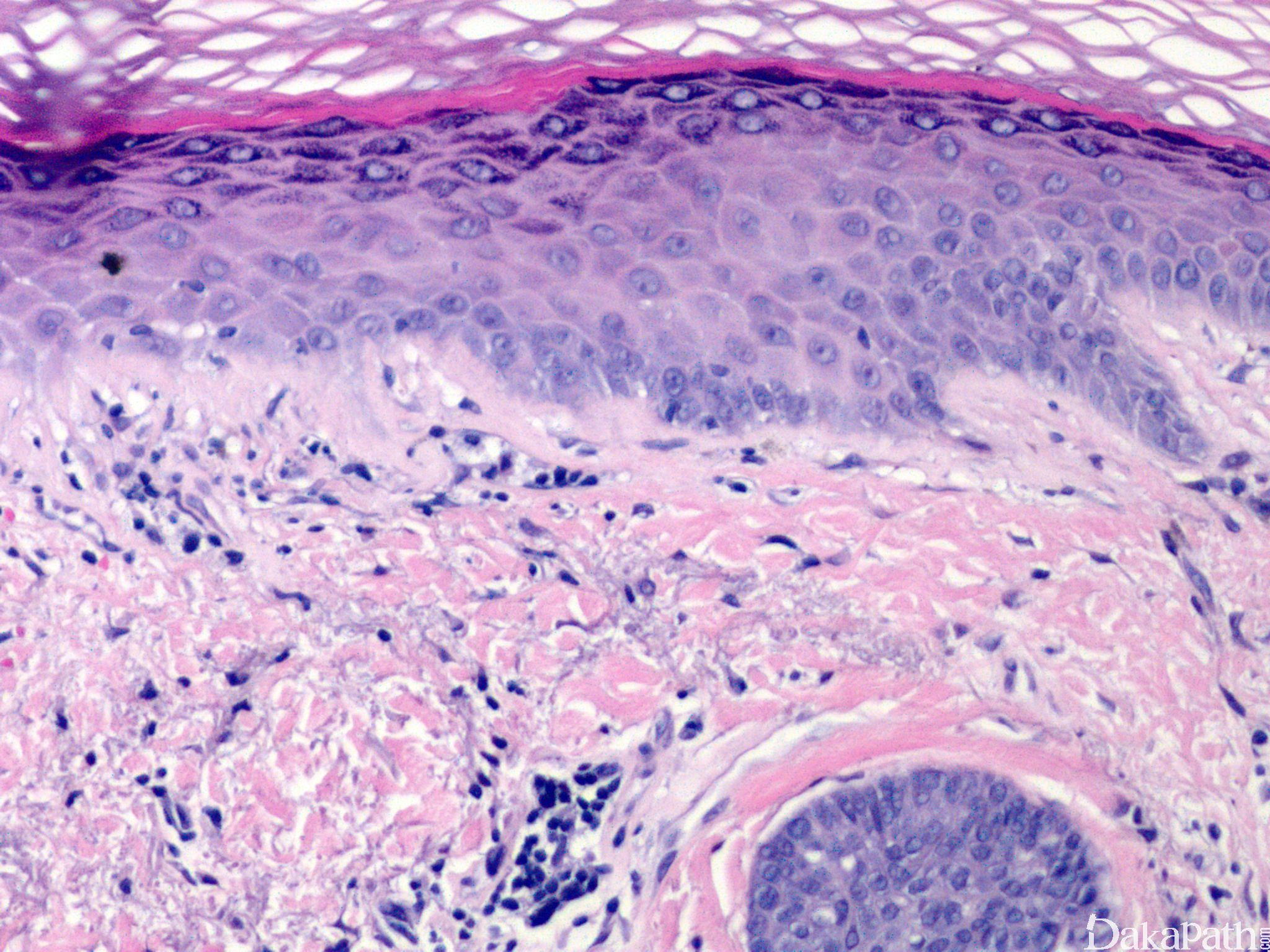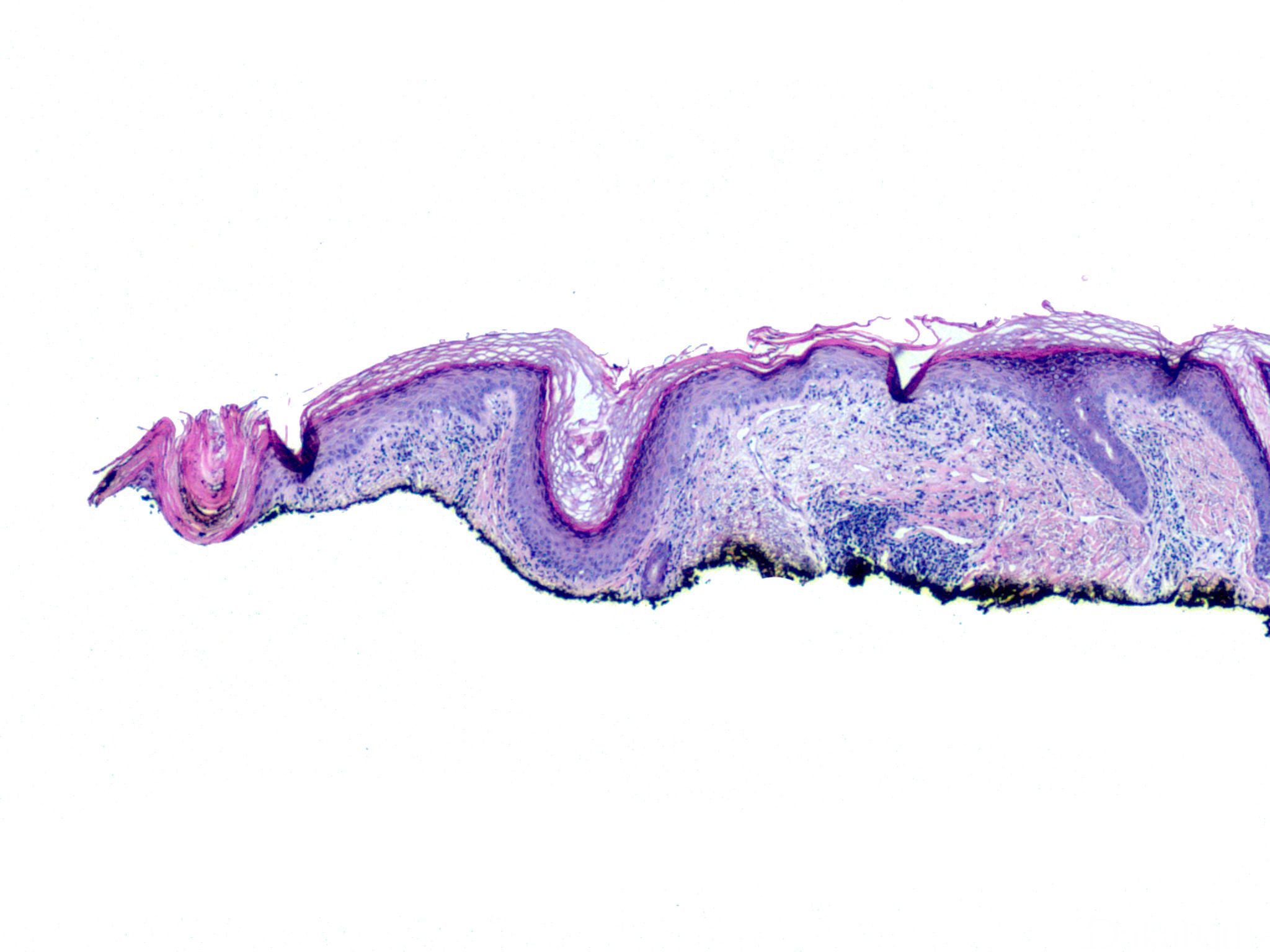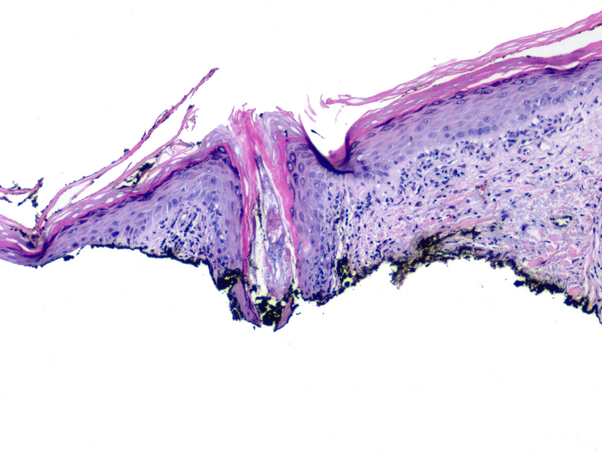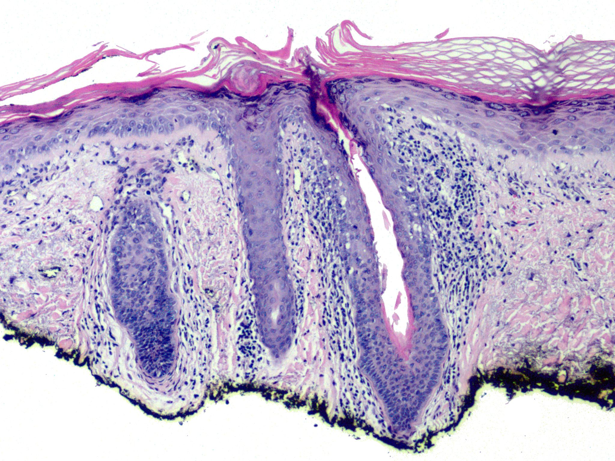 2. 表现为界面皮炎,伴有单个角质形成细胞坏死及表皮真皮交界处空泡化改变。可见致密或板层状正角化过度,表皮常萎缩。