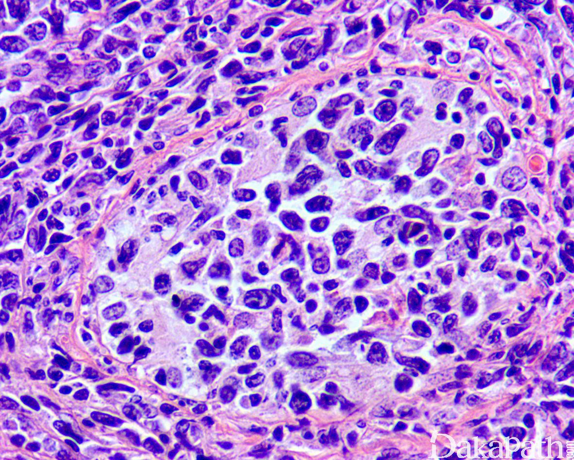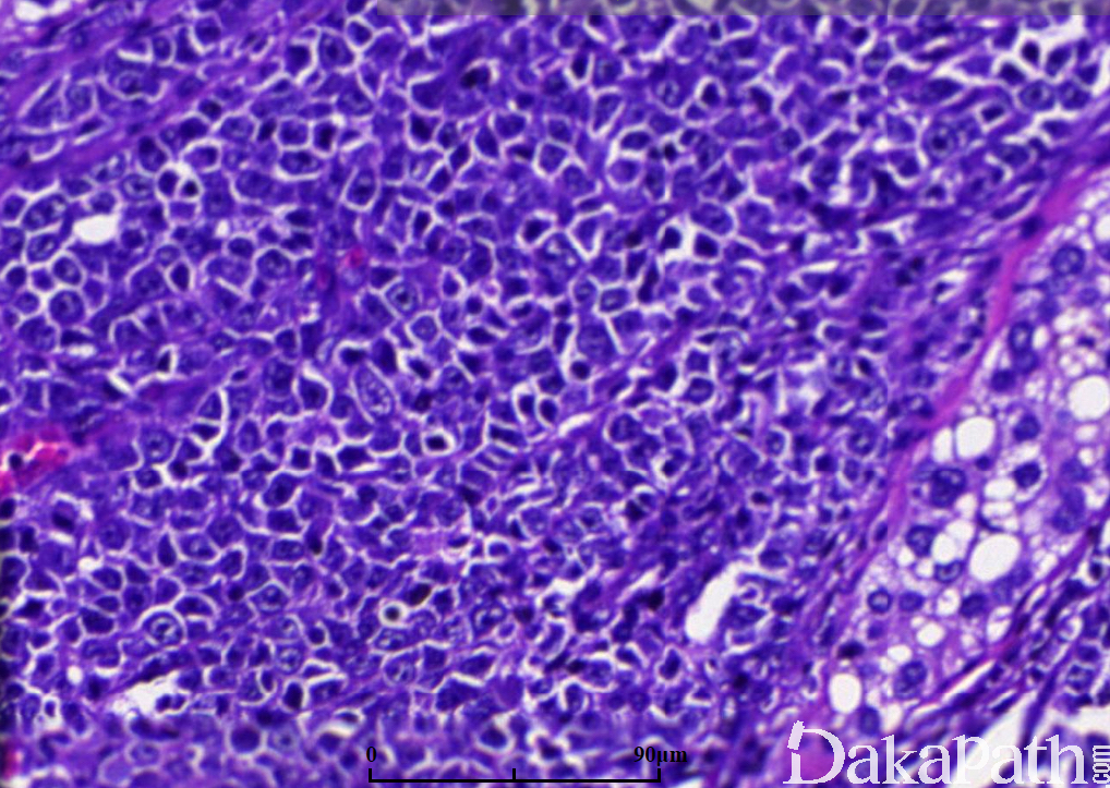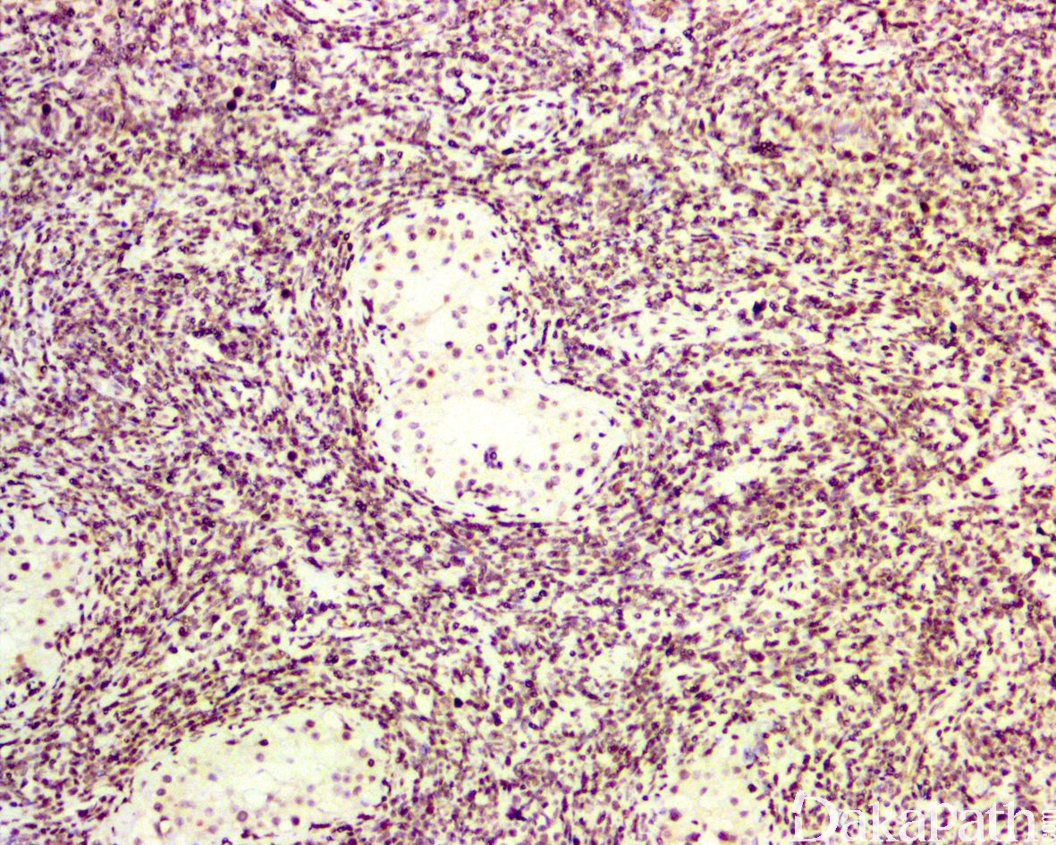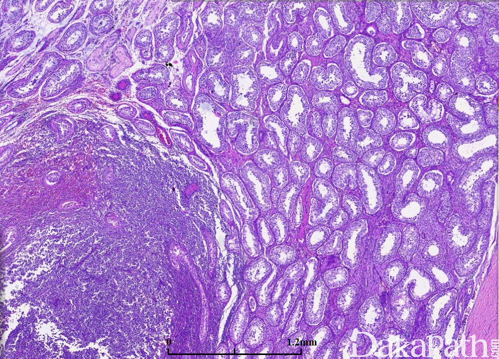 生殖细胞肿瘤:主要是精原细胞瘤,周围生精小管内可见原位生殖细胞肿瘤。免疫组化染色表达 OCT3/4,PLAP,SALL4 等,不表达 CD20 和 PAX5 可资鉴别。