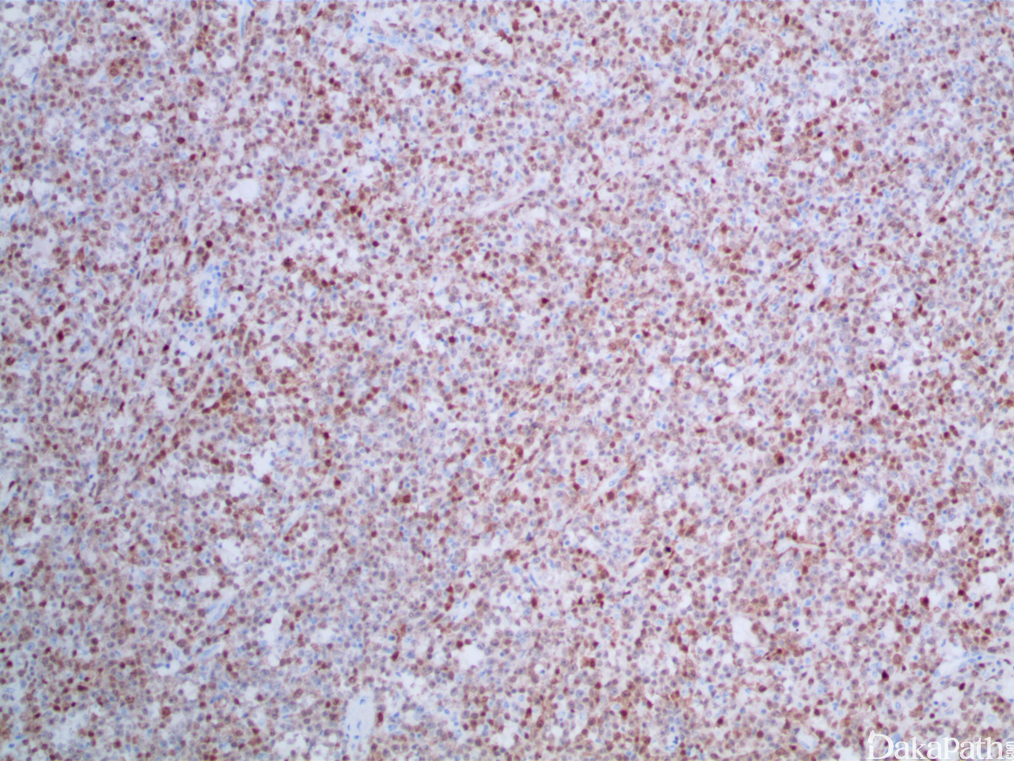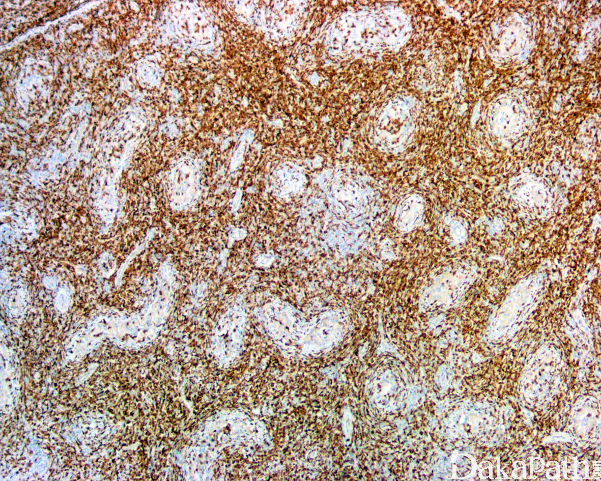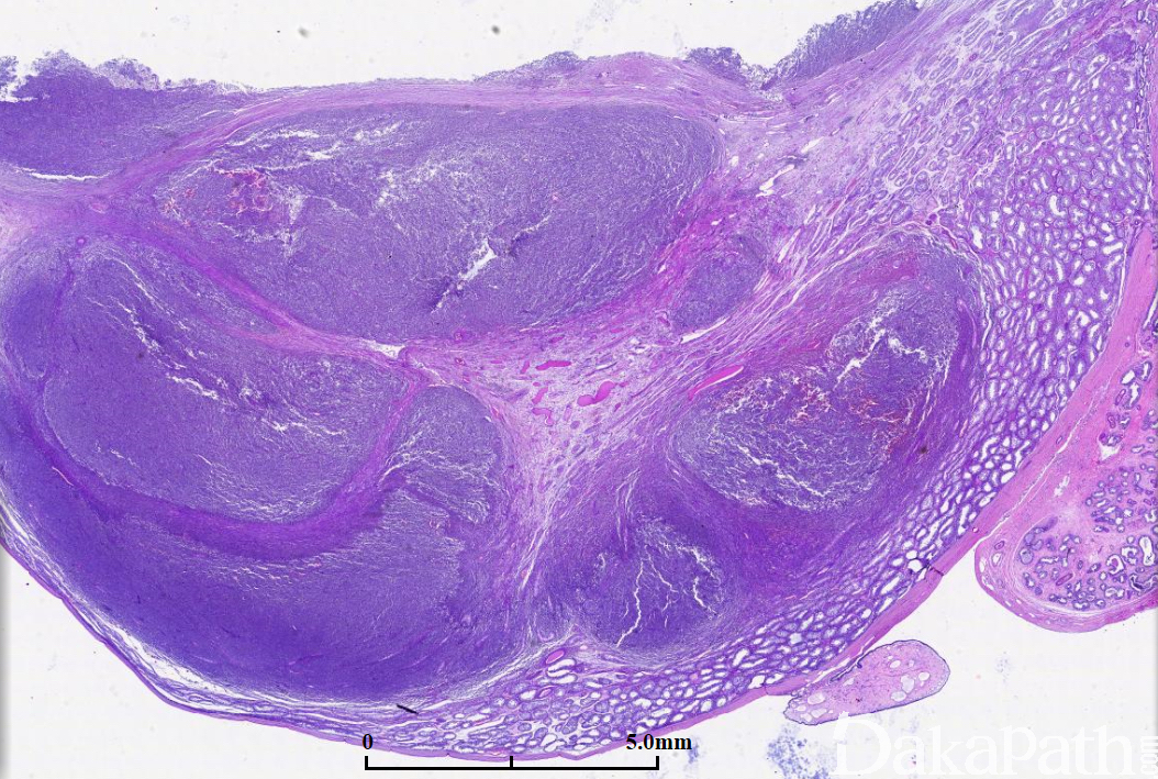 生殖细胞肿瘤:主要是精原细胞瘤,周围生精小管内可见原位生殖细胞肿瘤。免疫组化染色表达 OCT3/4,PLAP,SALL4 等,不表达 CD20 和 PAX5 可资鉴别。