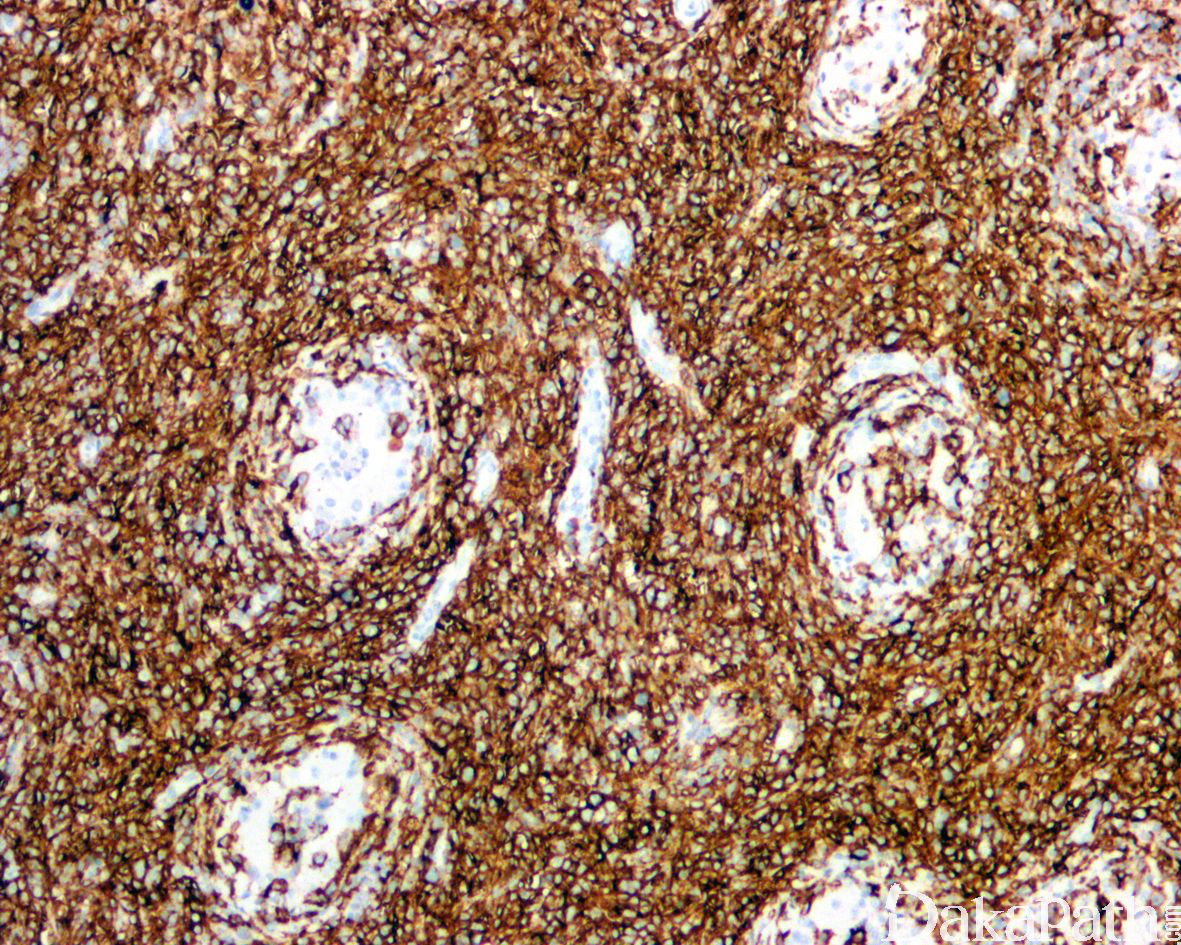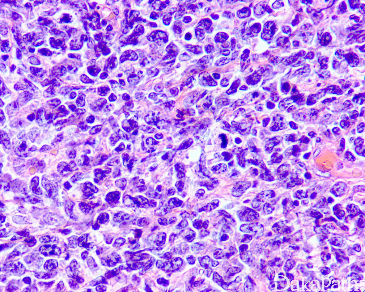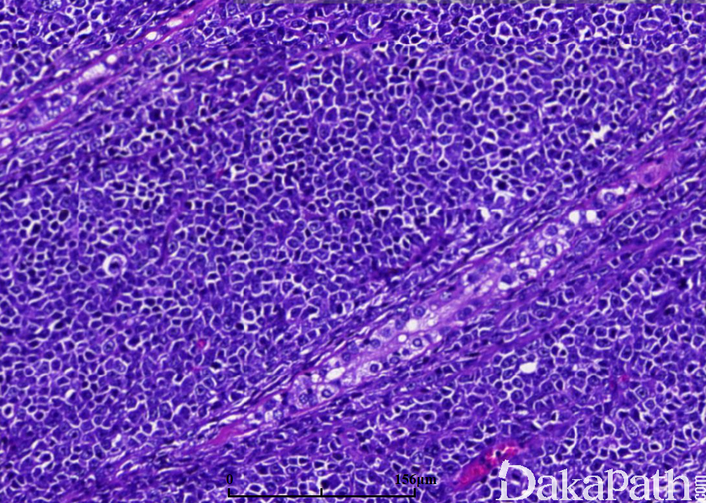 肿瘤由大的淋巴细胞构成,圆形或卵圆形,核形不规则,偶尔可见分叶核,核仁清楚,胞质稀少;