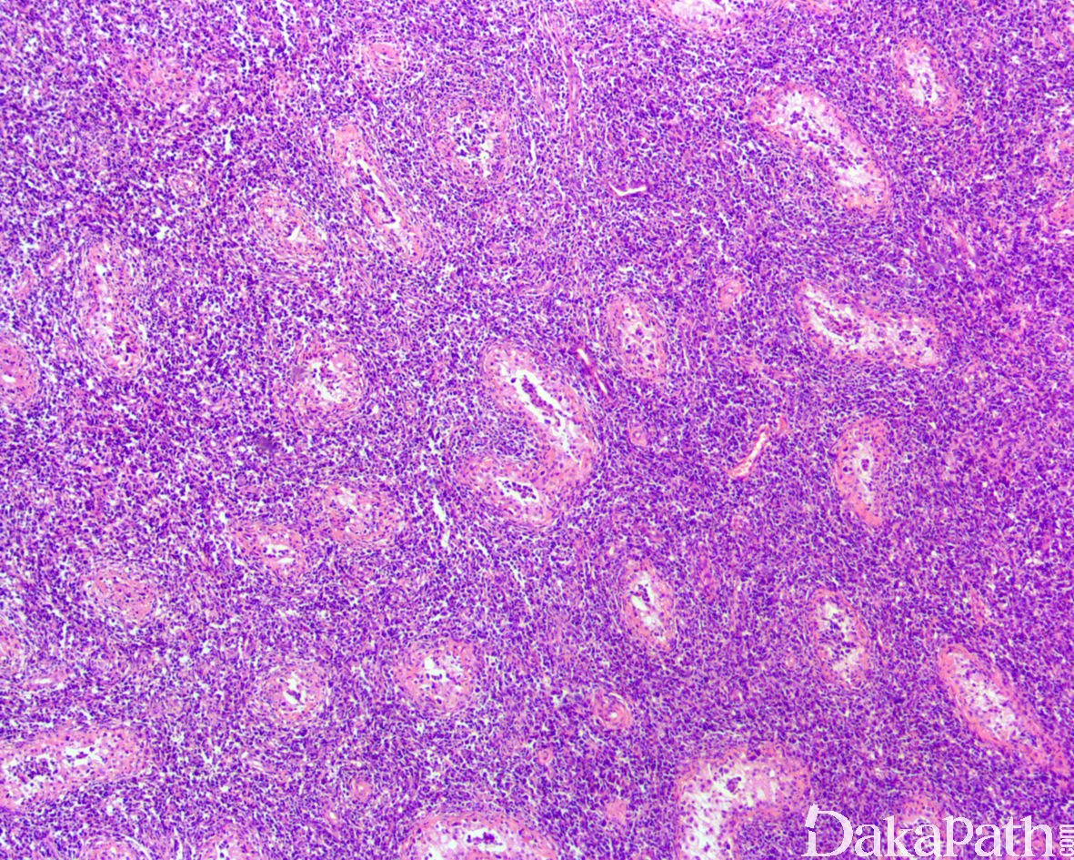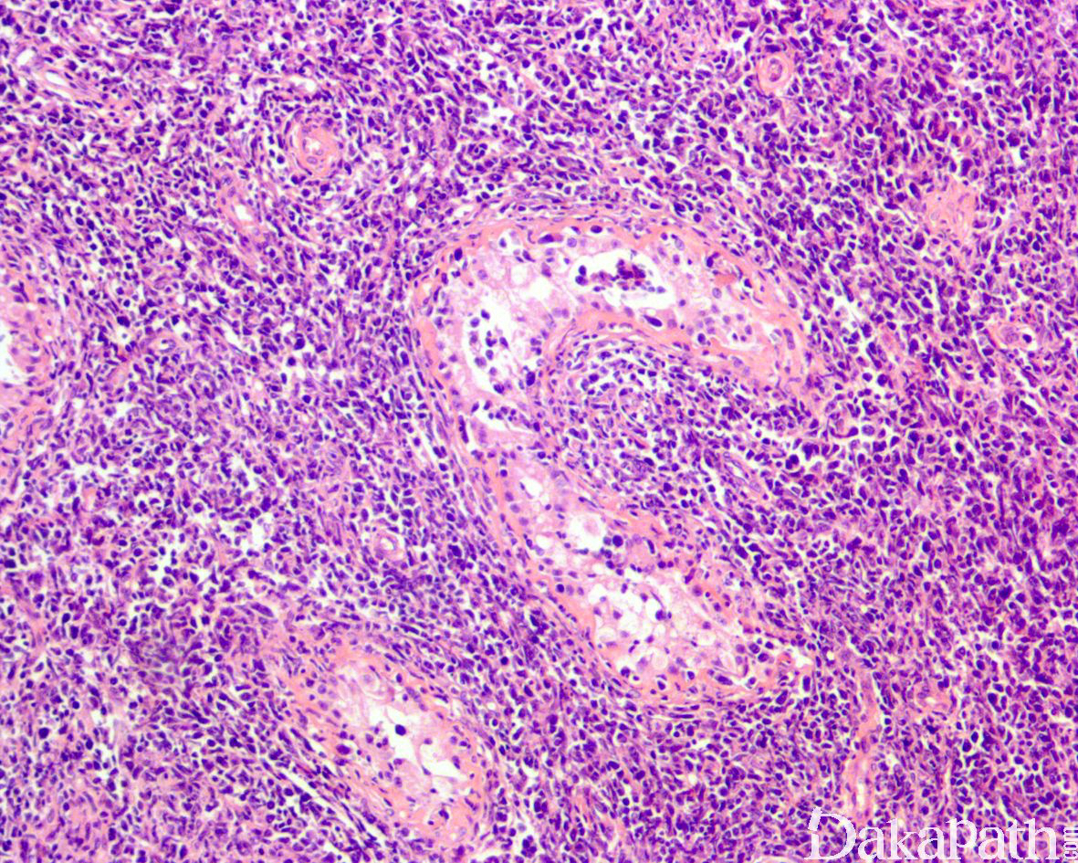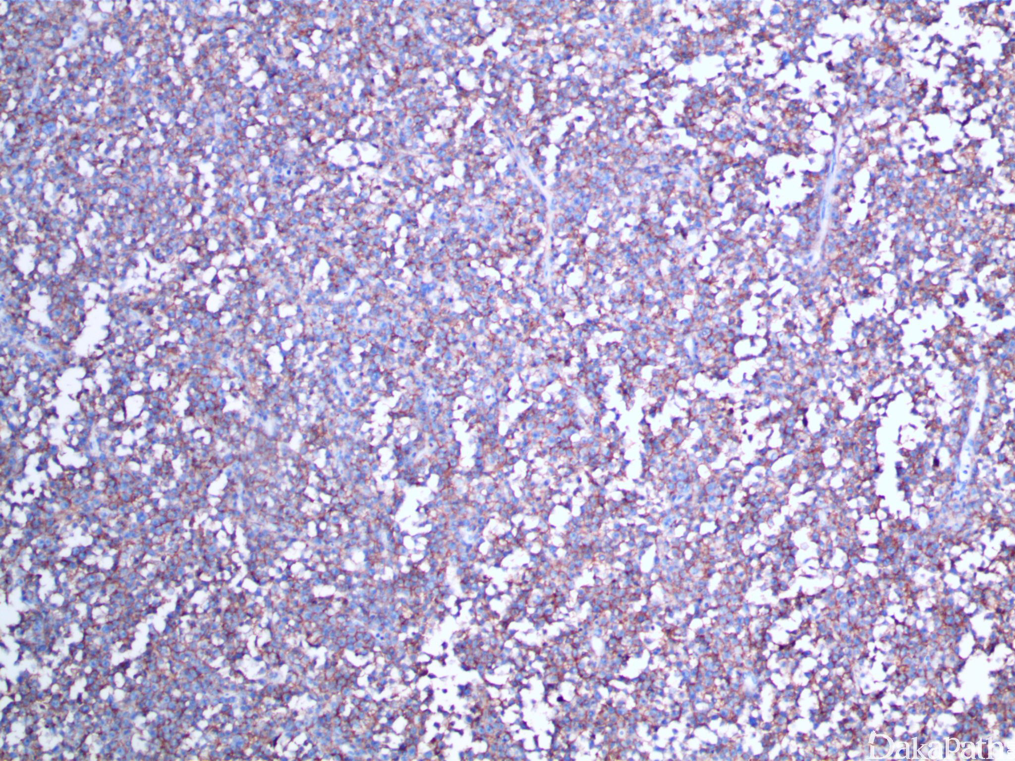 肿瘤由大的淋巴细胞构成,圆形或卵圆形,核形不规则,偶尔可见分叶核,核仁清楚,胞质稀少;