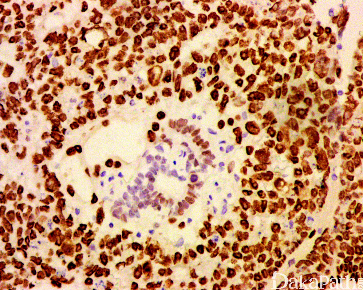 3. 细胞多形性,核重叠,大量凋亡小体有助于区分胚胎性癌与精原细胞瘤,必要时可行 CD30. CK 免疫组织化学染色;