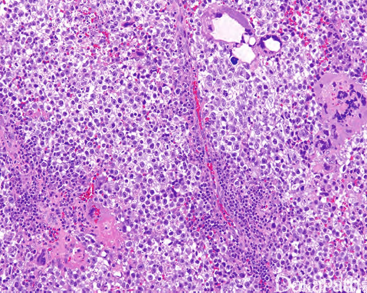1.10-20%的精原细胞瘤可见多少不等的合体滋养层细胞,可广泛散在分布,也可显著聚集分布;血清 HCG 通常< 500u/L