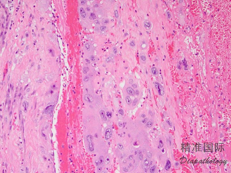 1,精原细胞瘤伴合体滋养层细胞:精原细胞瘤无绒毛膜癌可见的出血性背景和坏死,合体滋养层细胞在精原细胞瘤中通常为随意分布,无典型的绒毛膜癌中可见的围绕单核滋养层细胞生长。绒毛膜癌的单核滋养层细胞较精原细胞瘤瘤细胞更大,细胞大小差异和核多形性更明显。精原细胞瘤免疫组化染色表达 OCT4,而单核滋养层细胞表达 GATA3 等可资鉴别。
