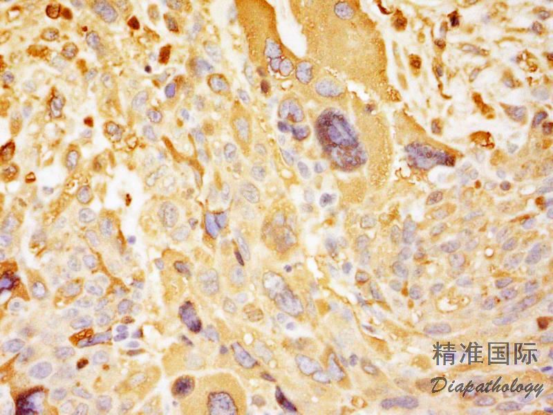 2,实体性卵黄囊瘤:免疫组化染色表达 AFP 和 Glypican3,仅偶尔表达 P63,合体滋养层细胞可表达 Glypican-3 而单核滋养层细胞不表达