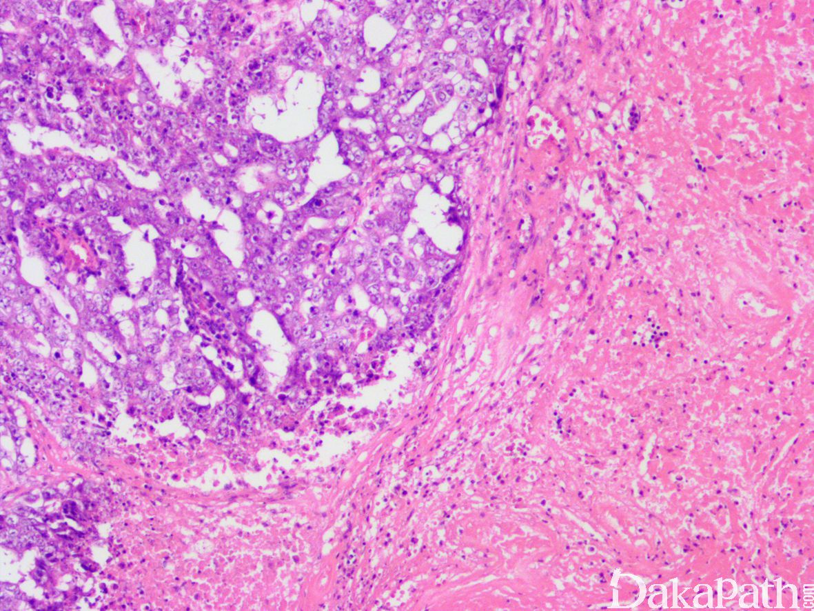 另外还有两种形态:多胚瘤样和弥漫性胚瘤结构,这两种结构提示胚胎性癌和卵黄囊瘤密切混合;