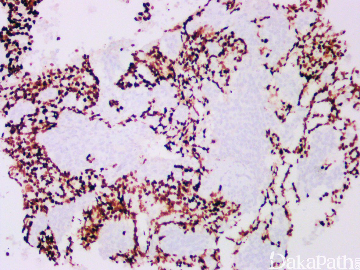 卵黄囊瘤 :形态更加多样;常见玻璃样小体和细胞外基底膜样物;缺乏纤维间质及淋巴细胞浸润。SALL4 和 Glypican-3 阳性,OCT4 和 CD30 阴性。