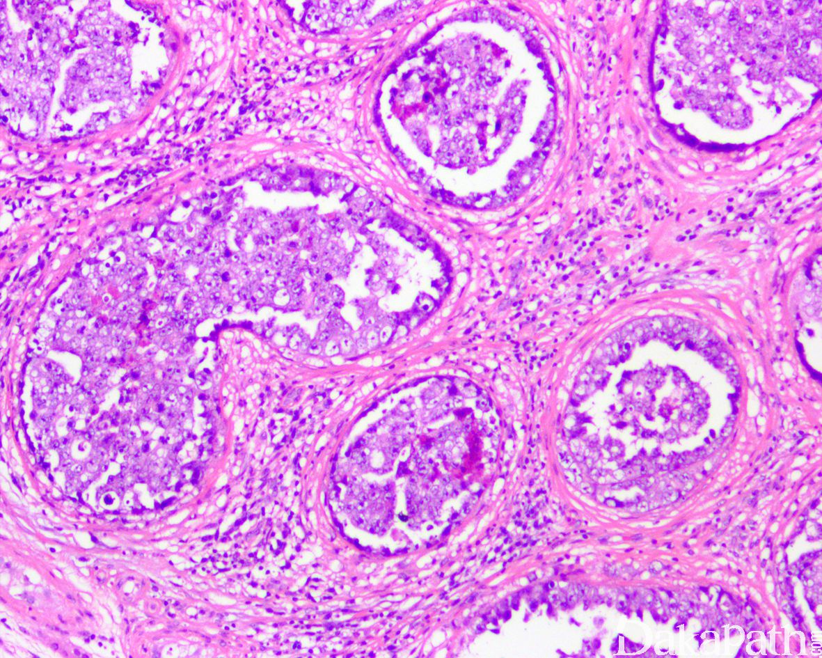 精原细胞瘤 :罕见缺乏腺样、管状、乳头状结构,瘤细胞界限相对清楚,无核重叠现象,核多形性小,核仁通常多个分布于核膜周围,PLAP、CD117 阳性,CK 和 CD30 一般阴性。