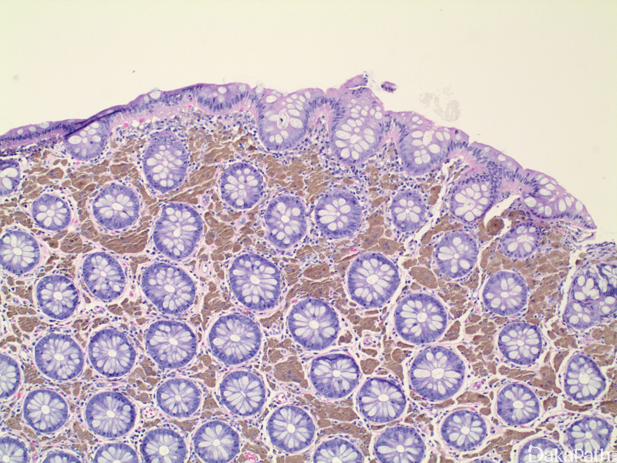 棕色肠道综合征 :肠平滑肌棕色色素沉着,由于脂肪及维生素 E 吸收不良导致,常可见乳糜泻及囊性纤维化。患者常见腹泻及腹痛,全肠道均可受累(食管至肛门),平滑肌细胞可见脂褐素,黏膜未见明显异常。