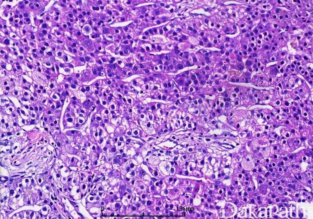 肿瘤细胞常类似肝细胞,通常体积较大,多角形,核空泡状,位于中央,可有核仁;