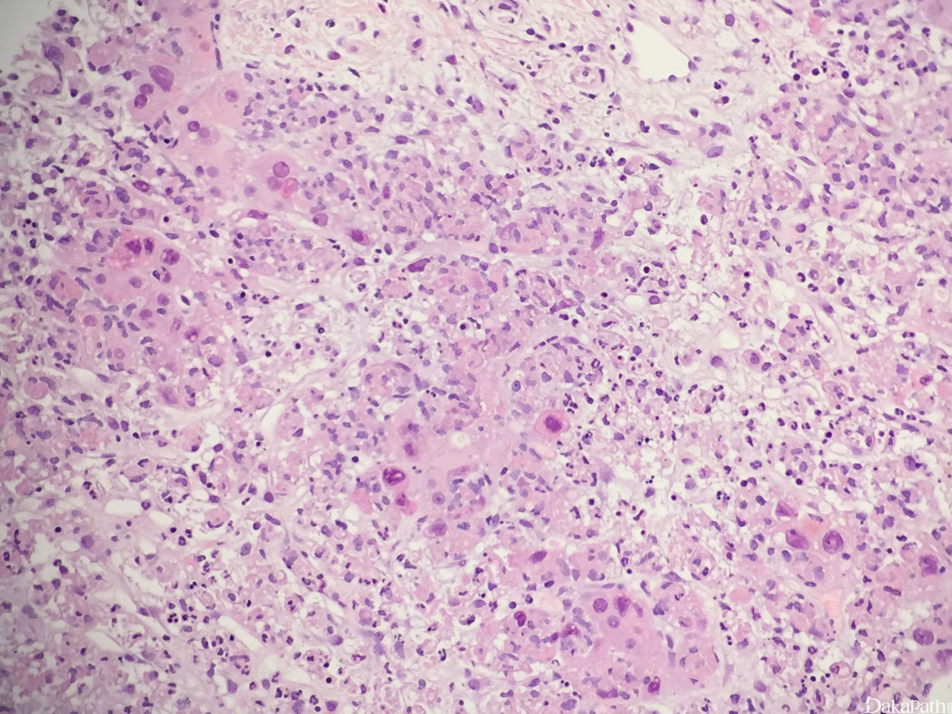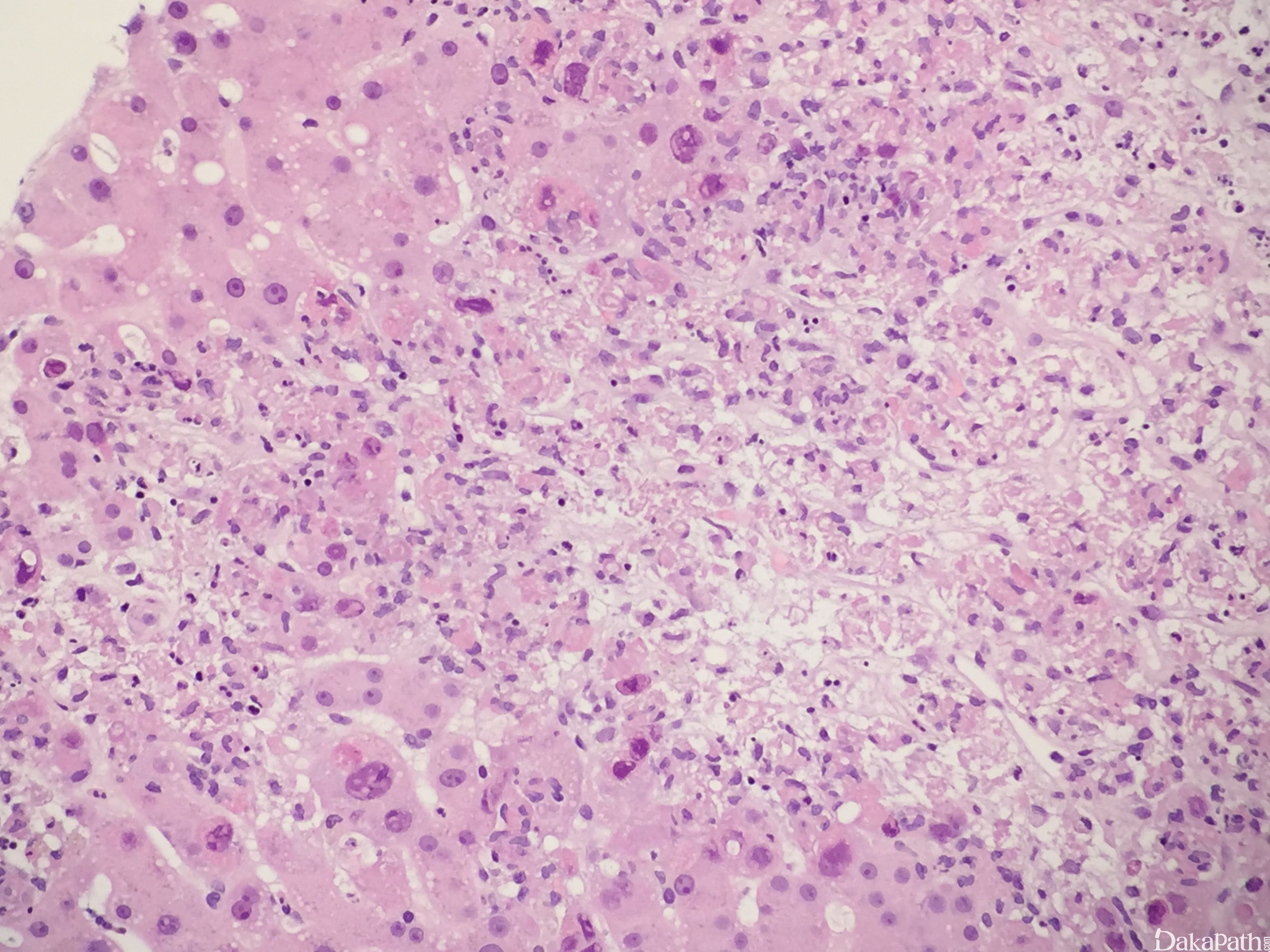 组织上可见小或大的肝细胞凝固性坏死灶,坏死灶周围无或极轻微炎症反应。可见轻度非特异性小叶及汇管区可见炎细胞(淋巴细胞、中性粒细胞及嗜酸性粒细胞组成)浸润。可见小的形成不良的肉芽肿及微脓肿。感染的肝细胞可见核内病毒包涵体伴特征性模糊不清的核外观及染色质边集,常见于坏死灶的周围。感染的肝细胞无巨大或多核改变。少数感染的胆管系统的胆管上皮可见病毒包涵体,引起坏死性胆管炎及胆管缺失。