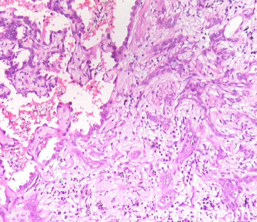 黏液表皮样癌:位于肺中央,具黏液腺、中间型细胞或鳞状细胞的混合,不伴有或伴有轻度异型性。高级别黏液表皮样癌与腺鳞癌鉴别困难,近端支气管内的外生性生长方式、黏液与鳞状细胞混合、含经典的低级别黏液表皮样癌区域支持高级别黏液表皮样癌的诊断;而细胞角化或鳞状角珠形成、原位鳞状细胞癌及小管样、腺泡样和乳头样生长方式等支持腺鳞癌的诊断。
