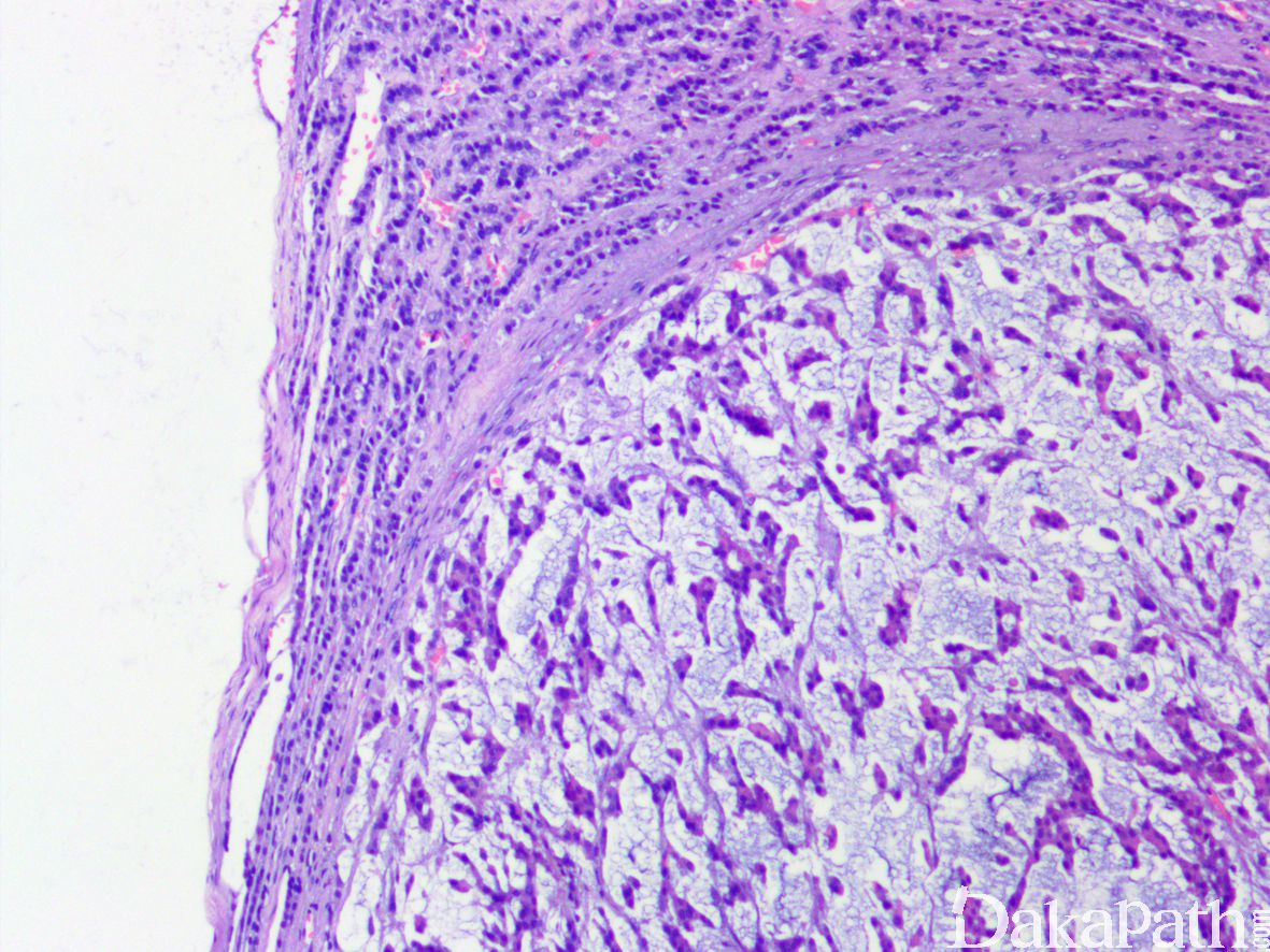 1,肿瘤细胞呈实性片状、梁状或微囊、网状排列,间质为富于多少不等的黏液性基质;局灶可伴有髓性脂肪瘤样化生;
